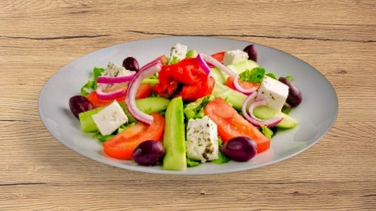 маруля, краставици, домати, мариновано сирене, печена чушка, червен лук, маслини, 400г