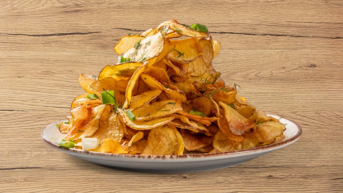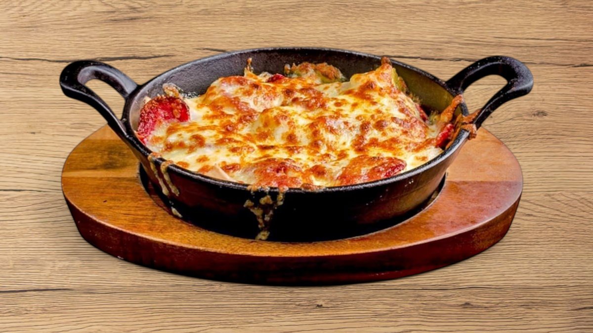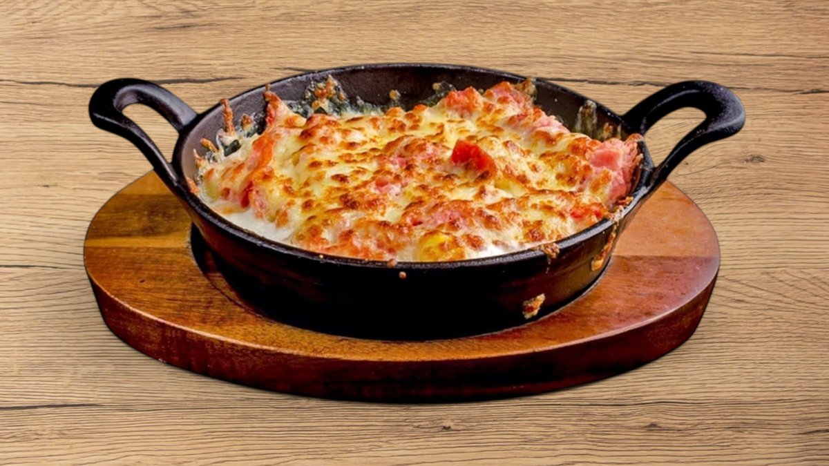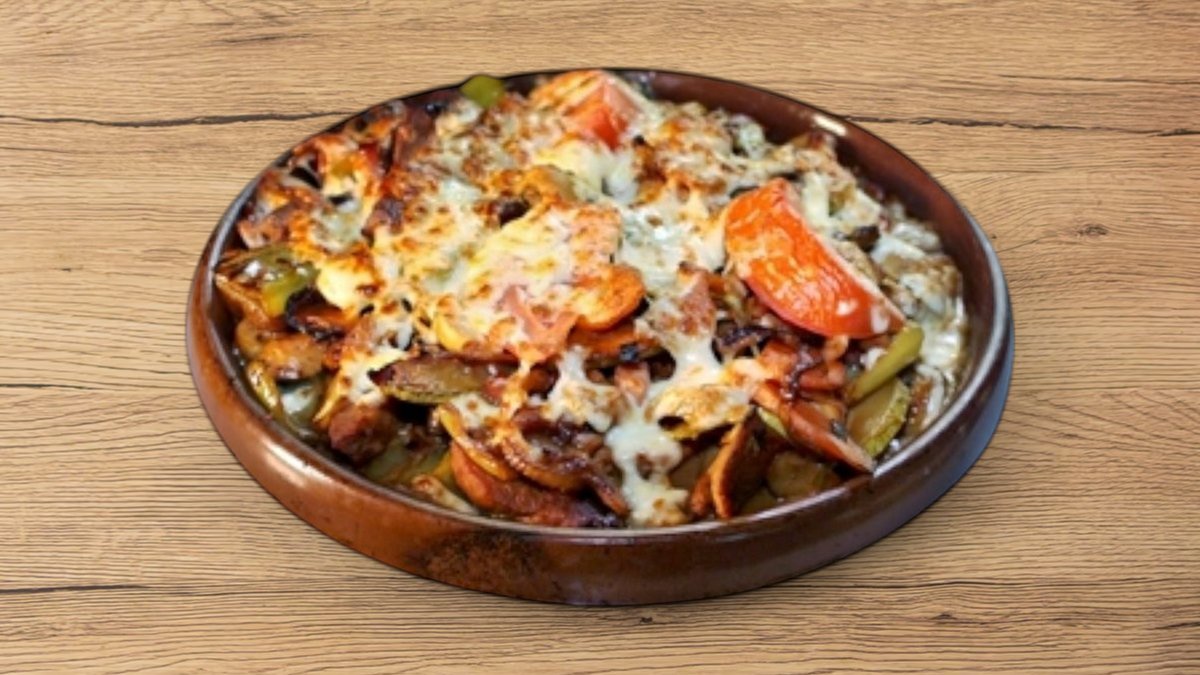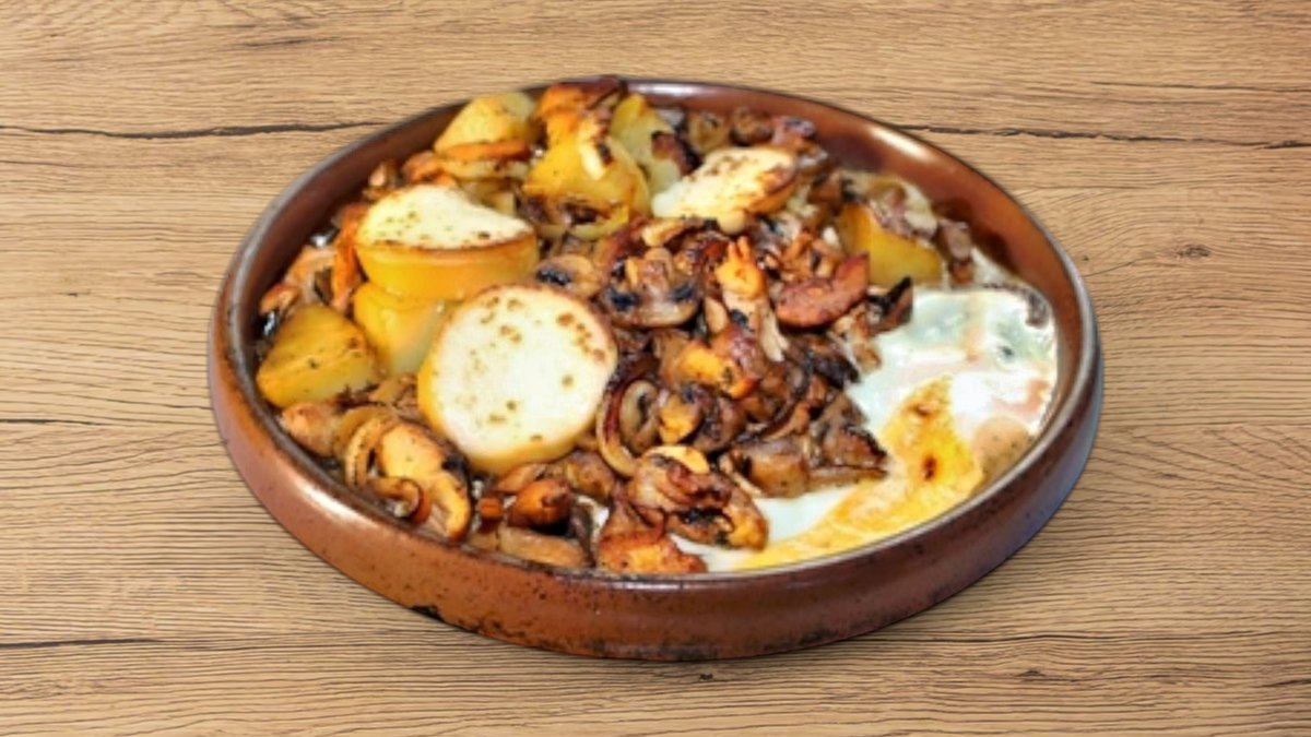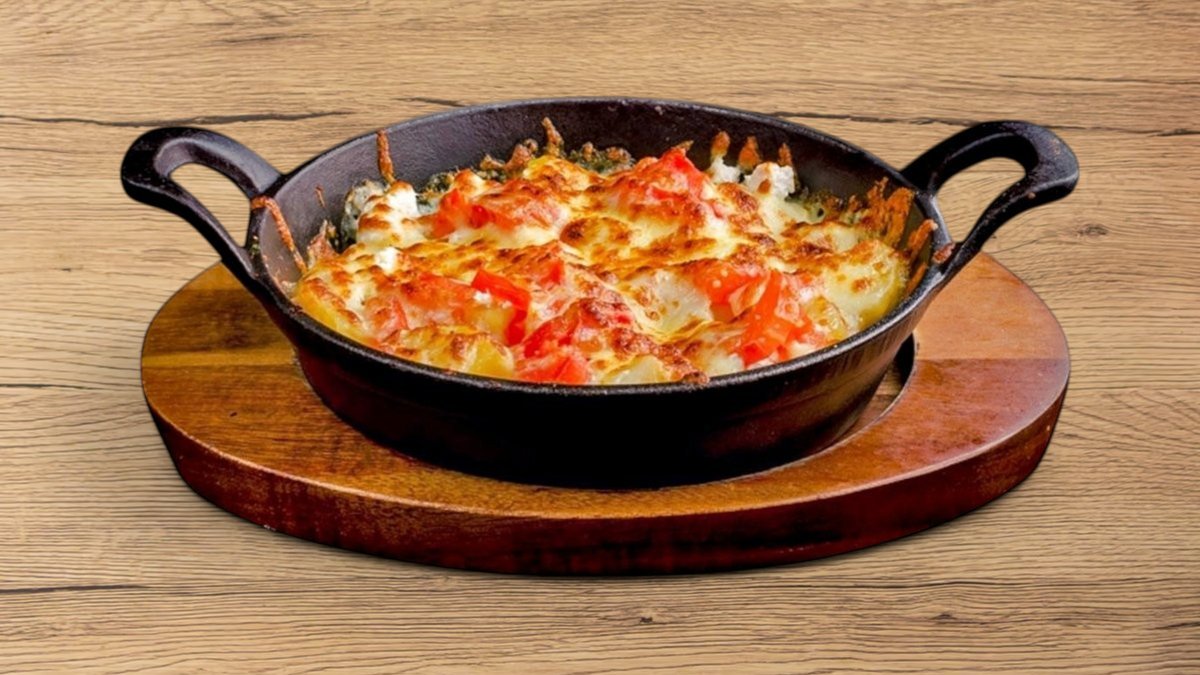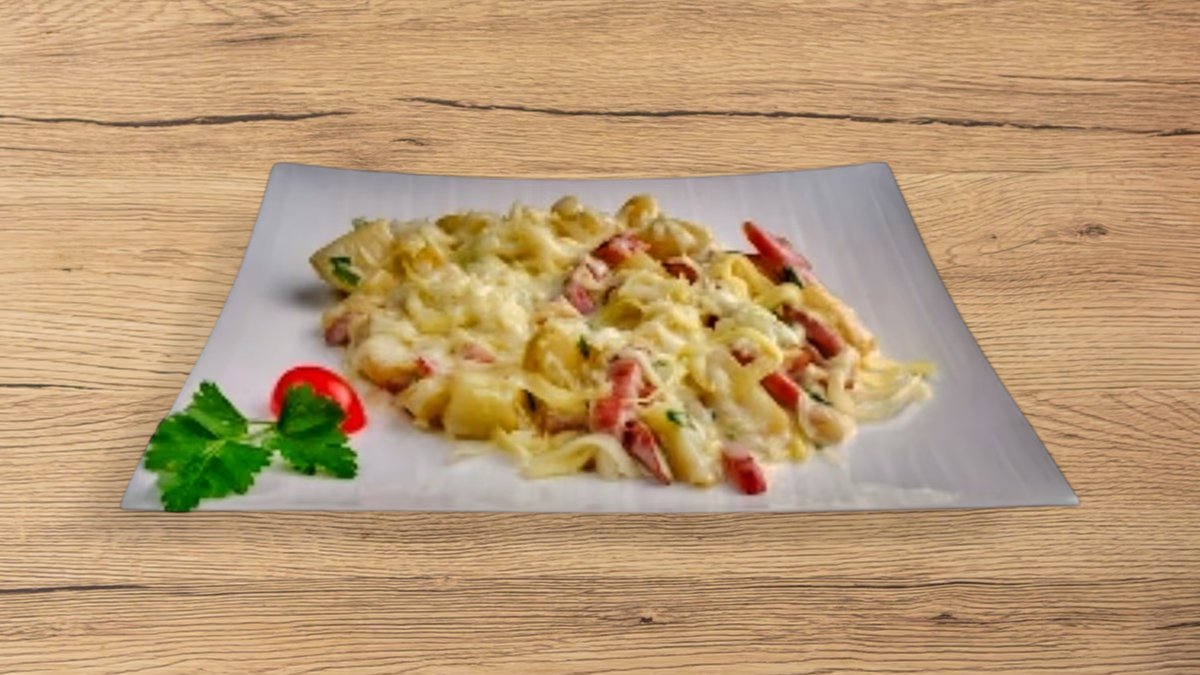сотирани картофи, бекон, пресен лук, сметана, кашкавал, 350г