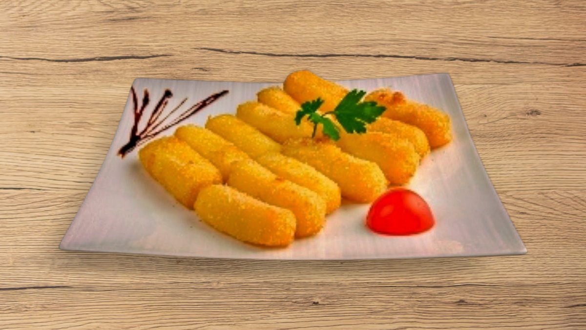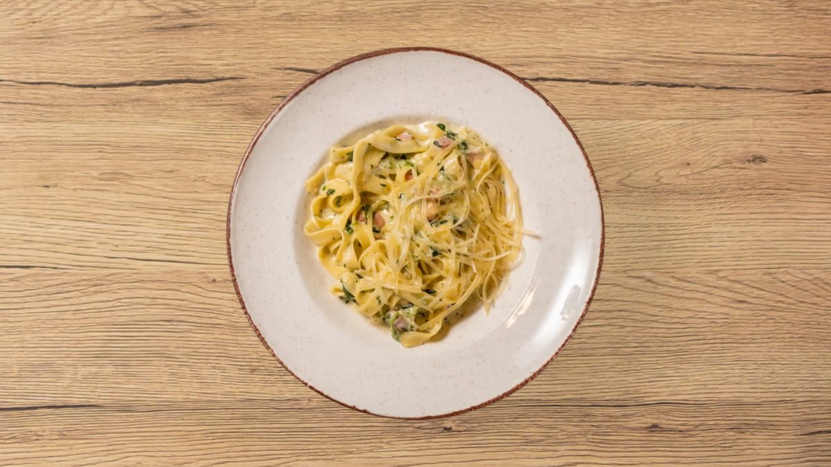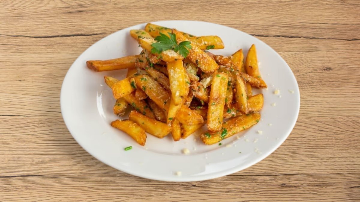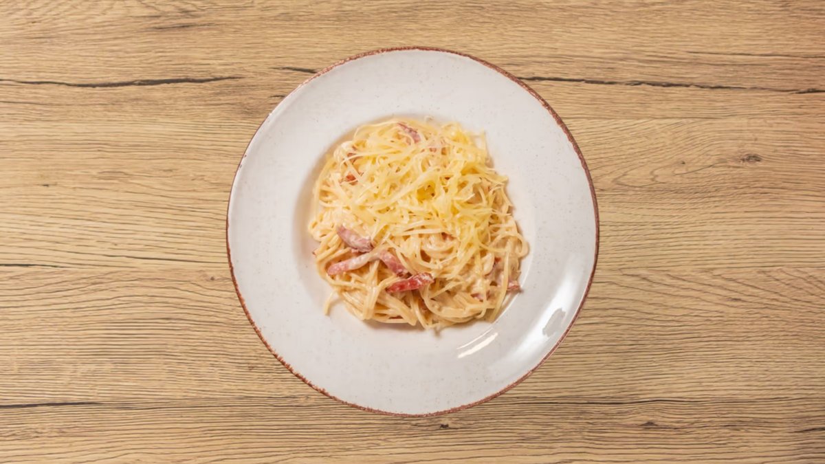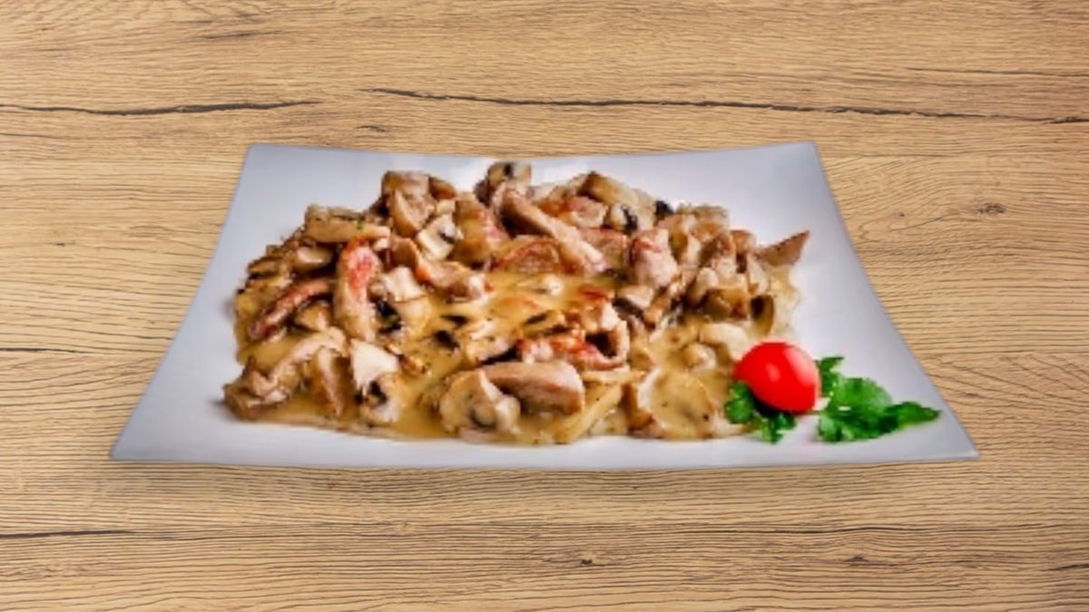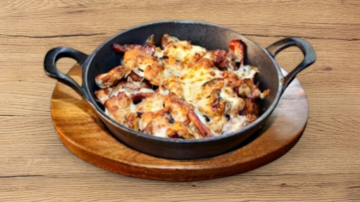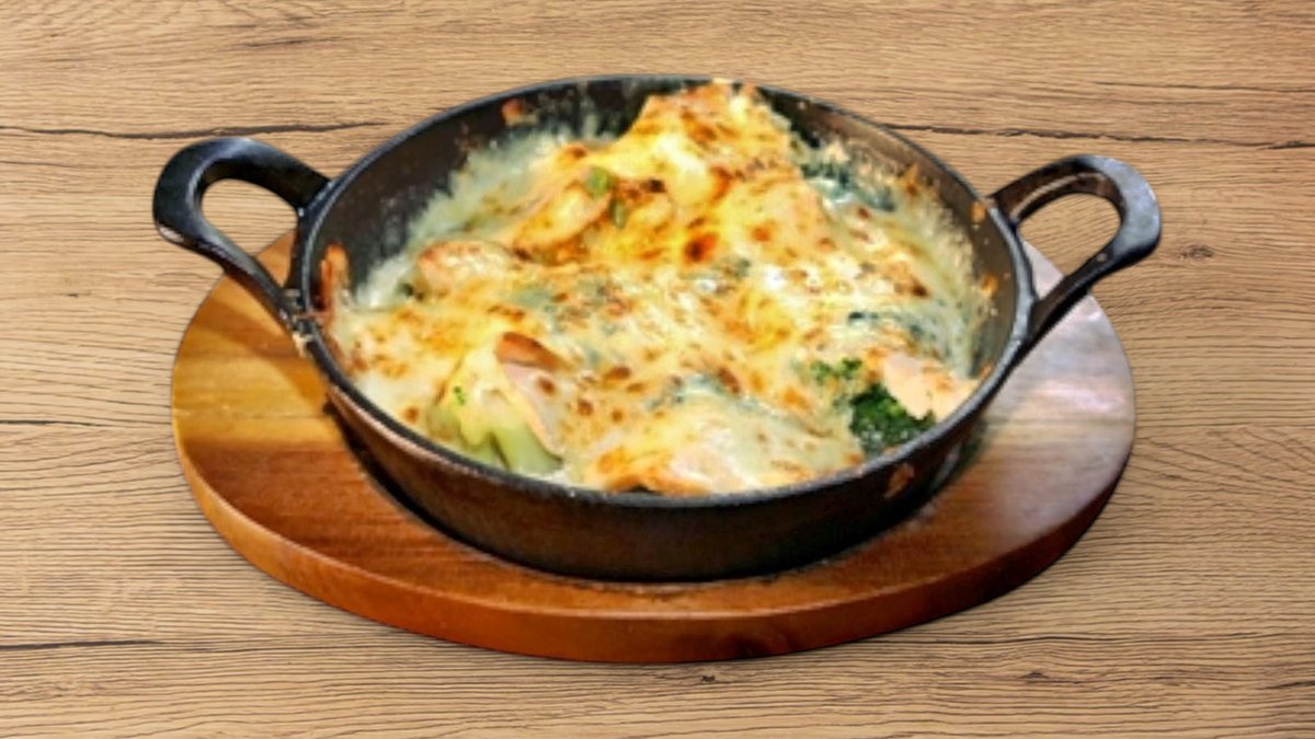 сотирани картофи, бекон, пресен лук, сметана, кашкавал, 350г