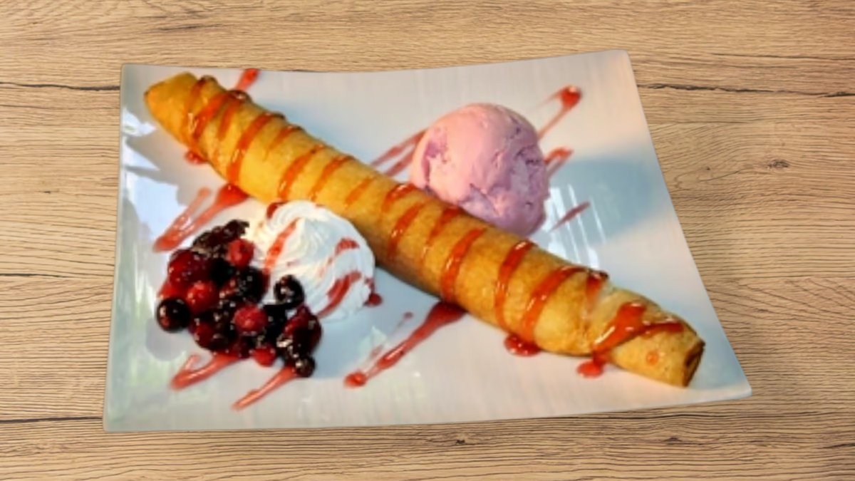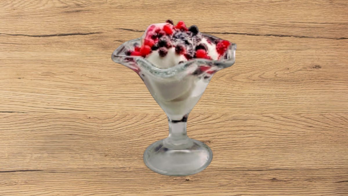 бял шоколадов мус, горски плодове, сладолед, горски сироп, сметана,