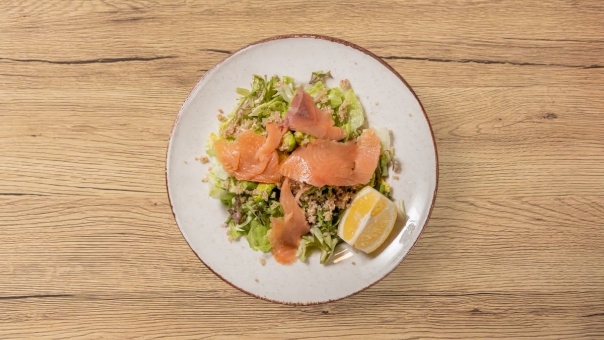 айсберг, лолоросо, киноа, авокадо, сьомга, лимонов дресинг, 400г