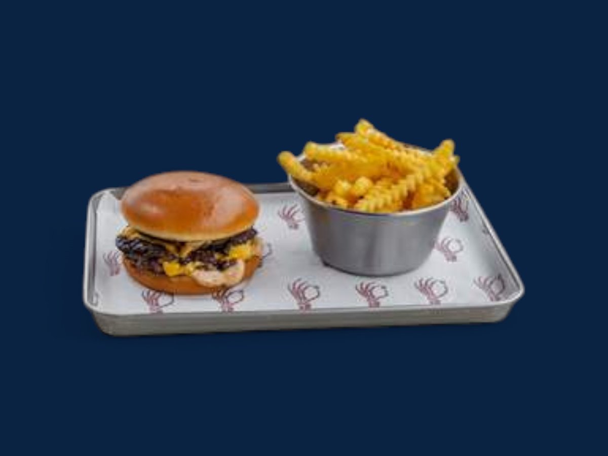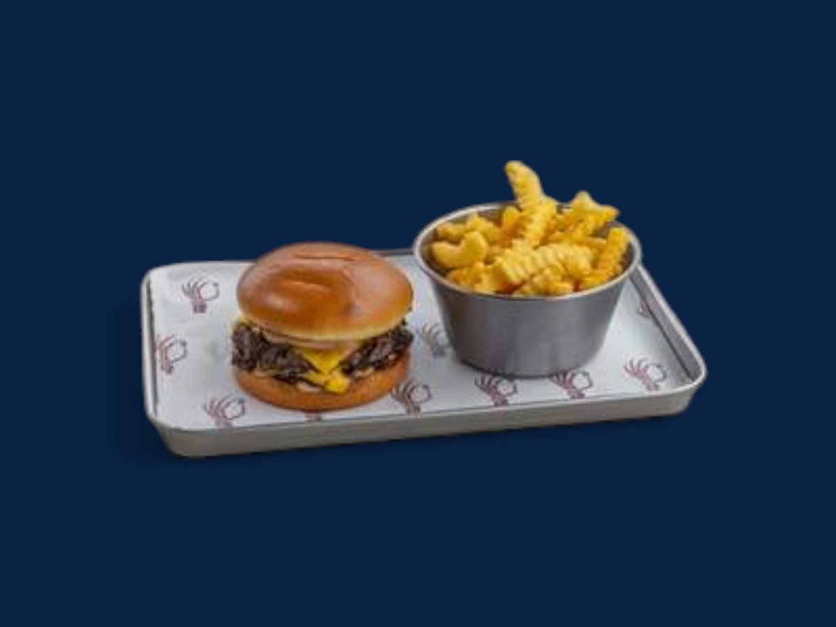 Бриош питка, три кюфтета, американско сирене, маринован лук, кисели краставици, 43.12 сос, пържени картофи