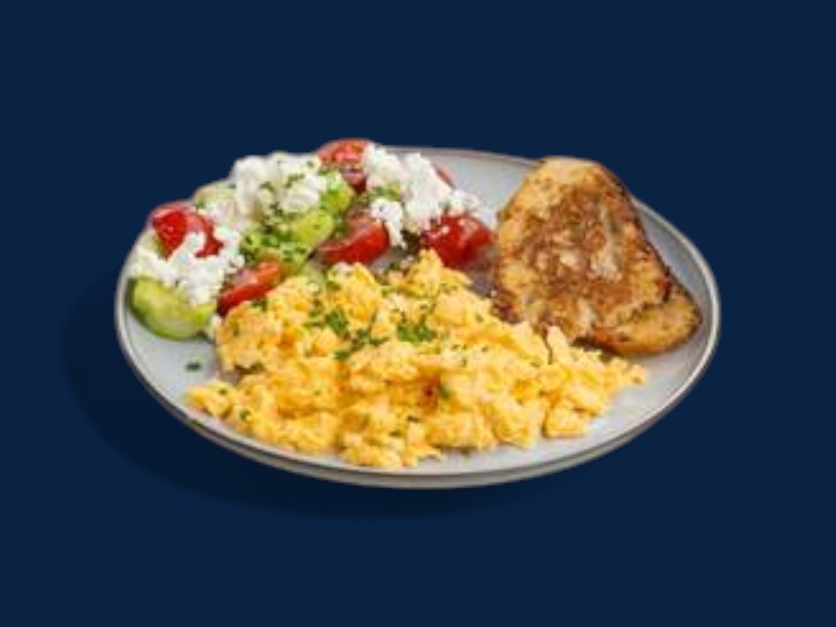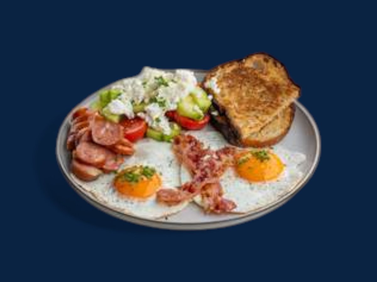 слънчев хляб, яйца на очи, Кезекрайнер, хрупкав бекон, Зеленчуци с фета 350г