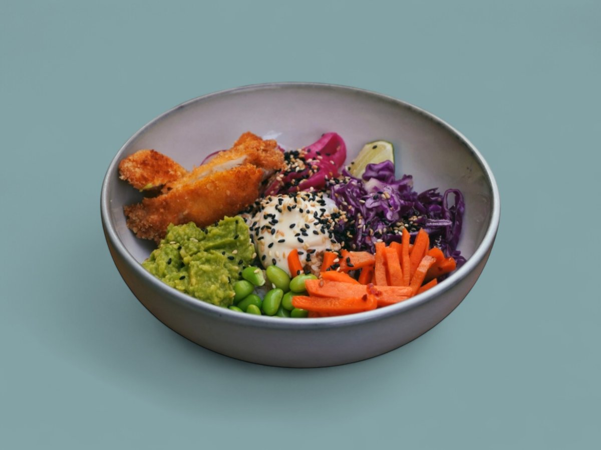 купа с бял ориз, пиле, мариновано зеле, пикантни моркови, едамаме, авокадо, репички, маринован лук, понзу дресинг, майонеза и сусам