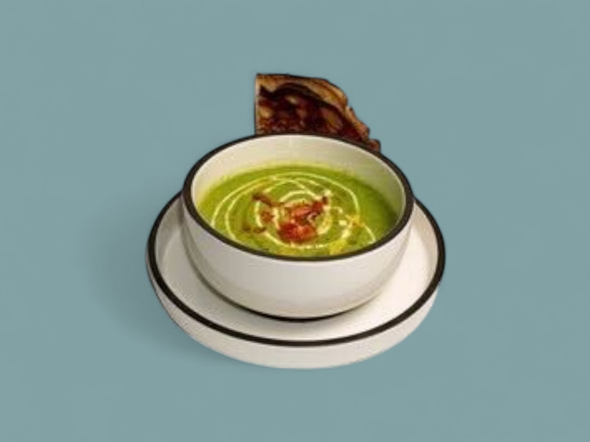 250г Крем супа от спанак с моркови, лук, целина и чесън, поднесена с препечен хляб, черен пипер, сметана и пресен червен пипер
