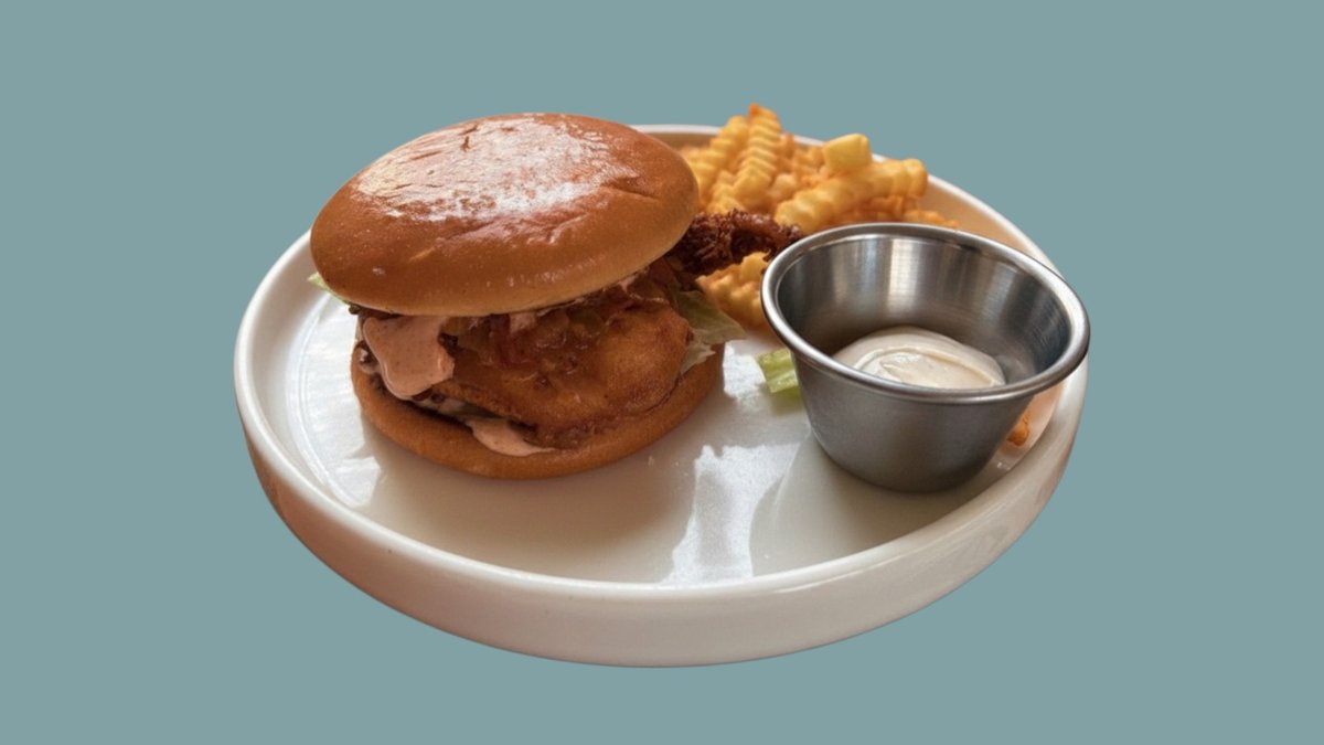 хрупкаво пилешко филе,бриош хлебче,пилешки бургер сос,пикантен чери релиш,мариновани краставички,пържени картофи и пепър майо 400г