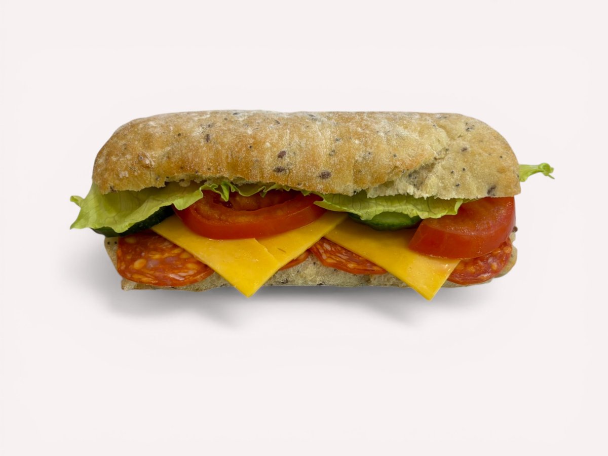 пълнозърнеста чабата, майонезен сос, салам Пипероне, чедър, домати, краставици и айсберг 250г