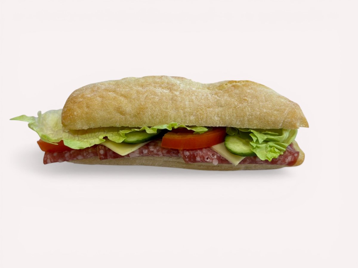 чабата, майонезен сос, салам Наполи, сирене гауда, домати, краставици и айсберг 250г