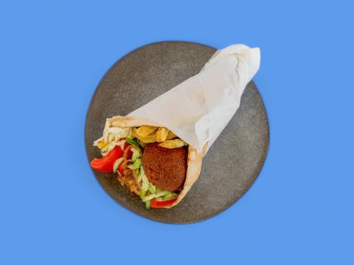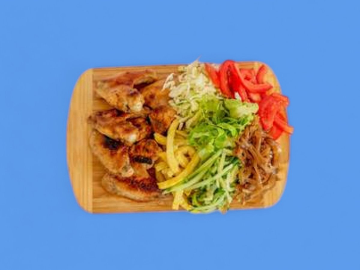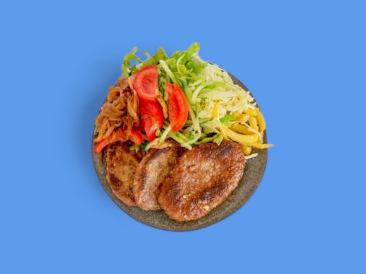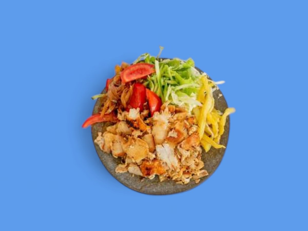 голяма порция по избор с пилешко телешко или фалафел, плюс гарнитура зеле, зелена салата, краставици, домати, печен лук 650г