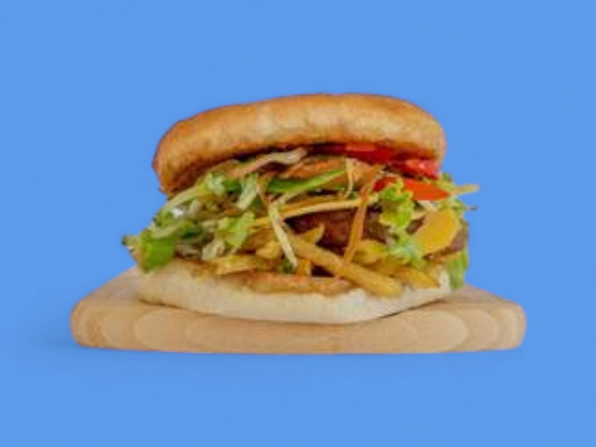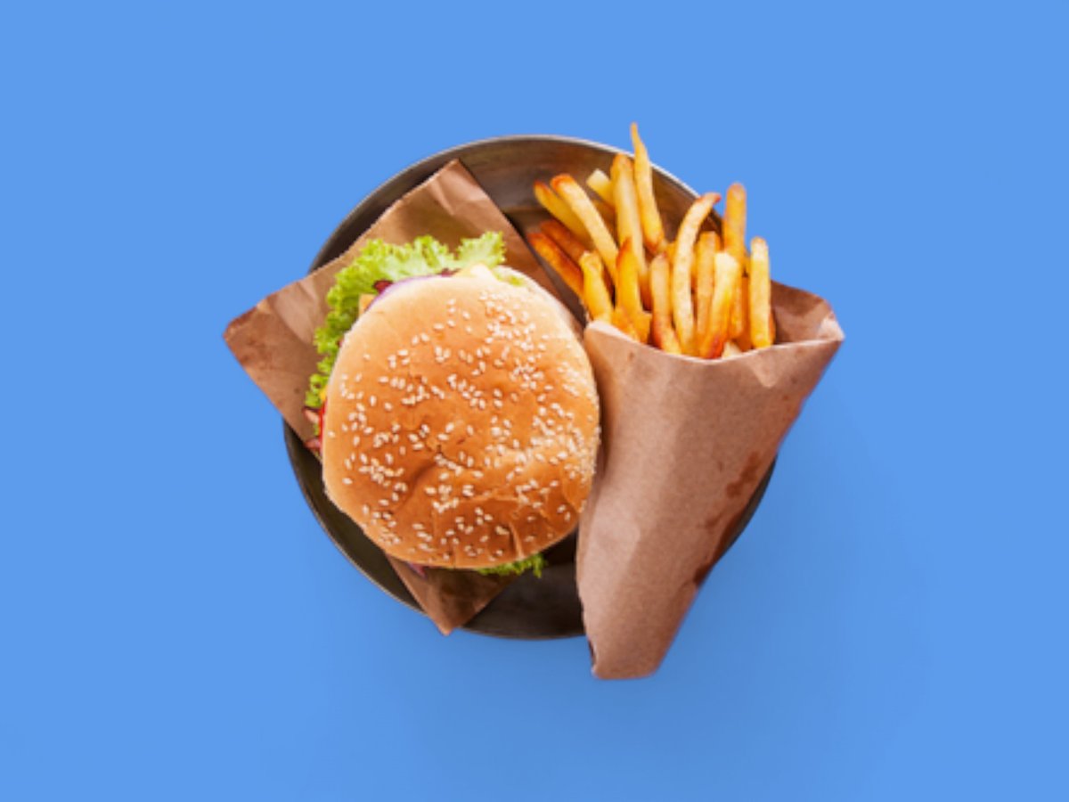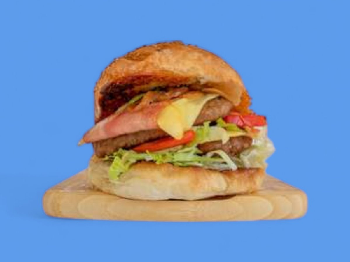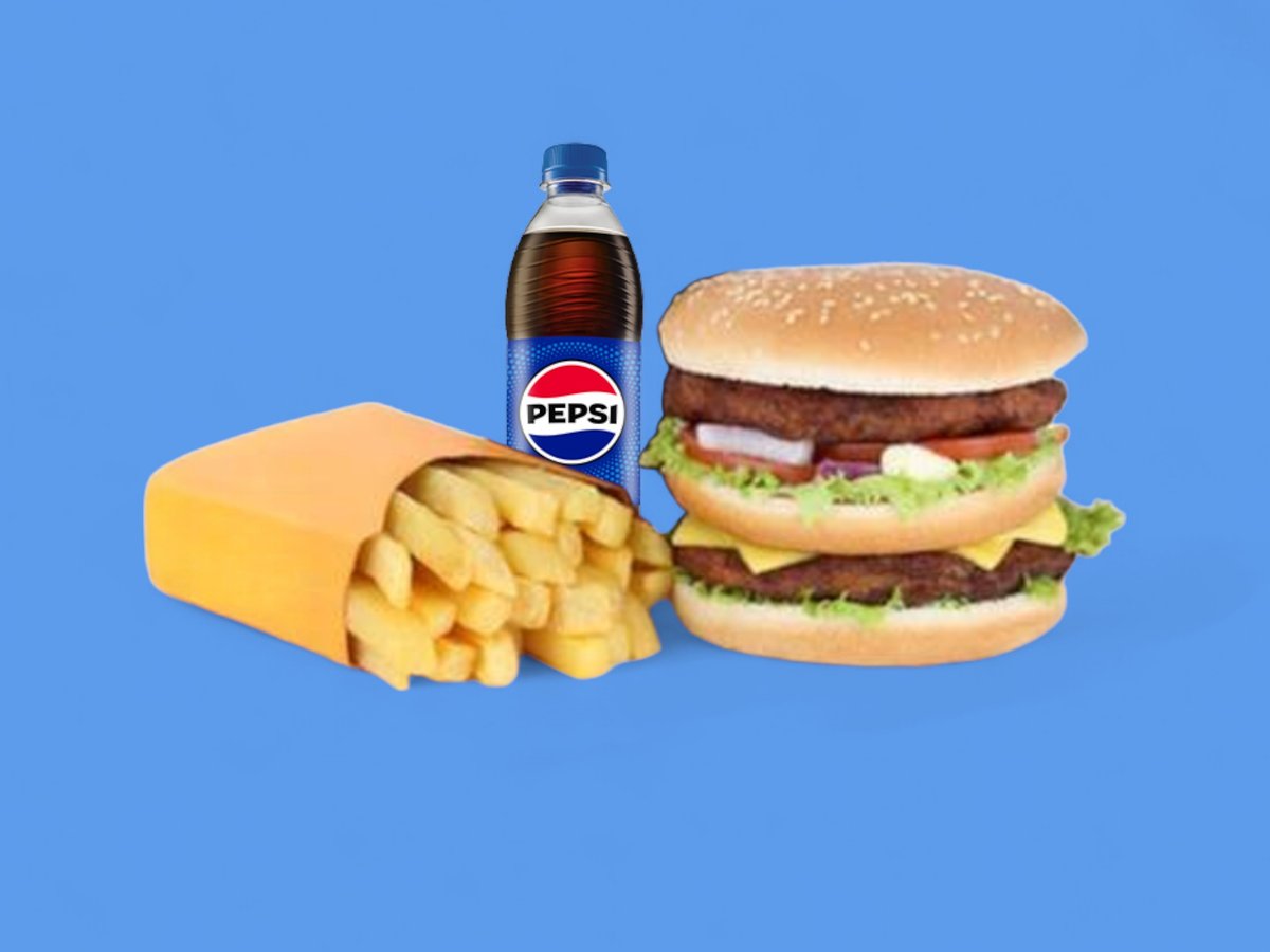 хамбургер с телешки кюфтета 2бр, кашкавал и бекон, порция картофки и безалкохолно Pepsi 500мл