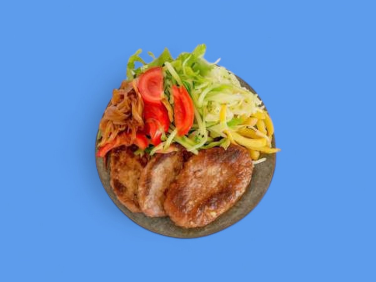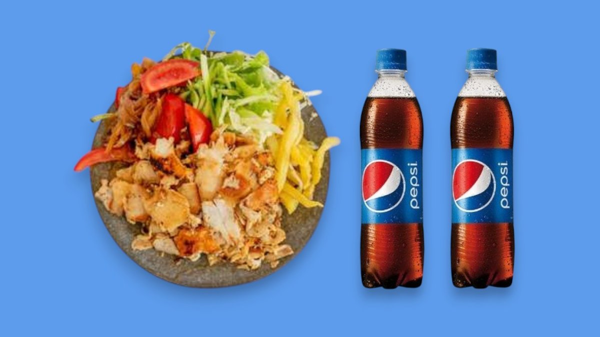 месо 400г + картофи 200г+ питки 2бр + чеснов сос 90мл + лют сос 90мл + зеленчуци + Pepsi 2бр 500мл