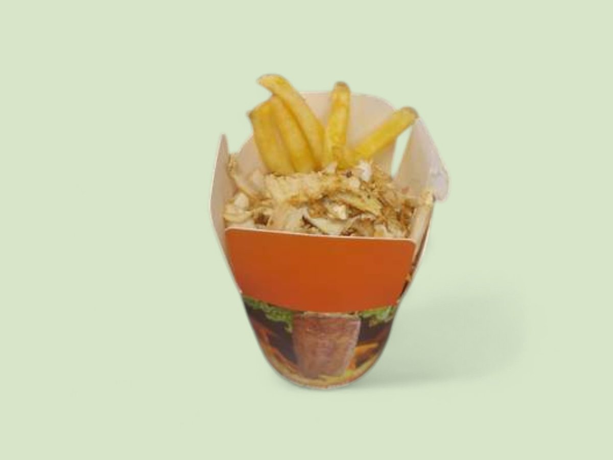 месо от дюнер, кашкавал и топено сирене, пържени картофи, зеле,зелена салата, домати, краставици, пресен и печен лук, кисели краставици, чеснов сос 500г