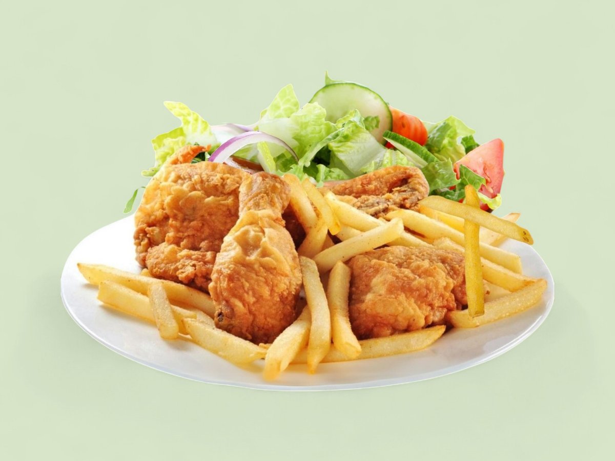 хрупкаво пиле 4 броя, пържени картофи, зелена салата, домати, кисели краставици, арабска питка, чеснов сос, кетчуп