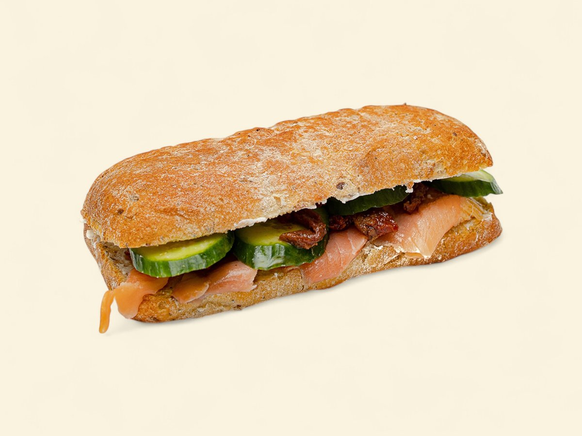 пълнозърнеста чабата, Чоризо, крема сирене, сушен домат, краставица, кашкавал, размер по избор