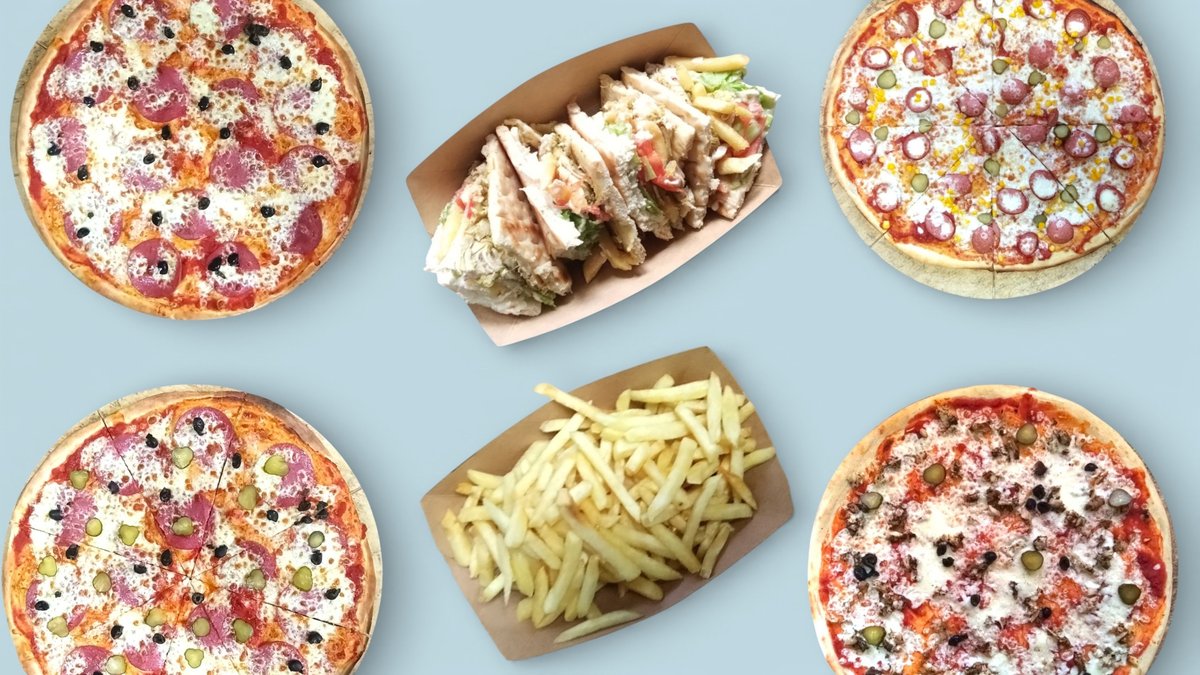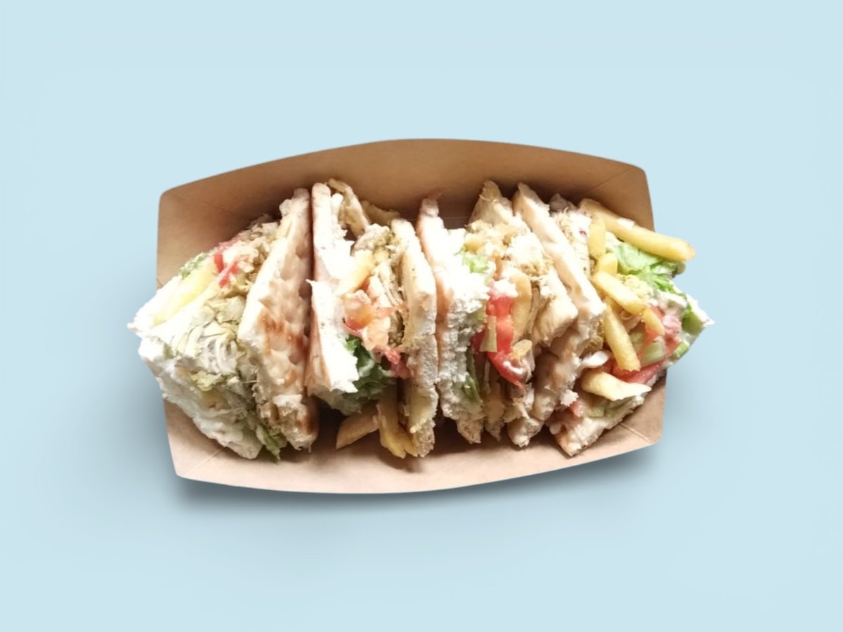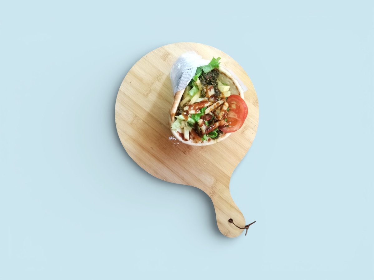 Дърпано пилешко или свинско, пържени картофи, моцарела, домати, зелена салата, кисели краставички, сосове