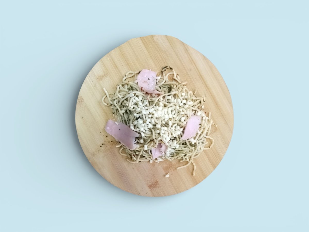 Спагети барила, сос песто-барила, бекон, шунка, пармезан