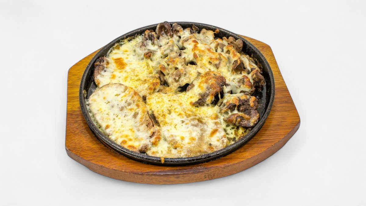 пилешки сърца, воденички и дробчета, телешки език и чесън, запечени с кашкавал и поръсени с шарена сол 500г