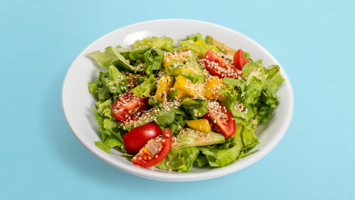 авокадо, зелена салата, чери домати, манго, зехтин, горчица, сол, сусам
