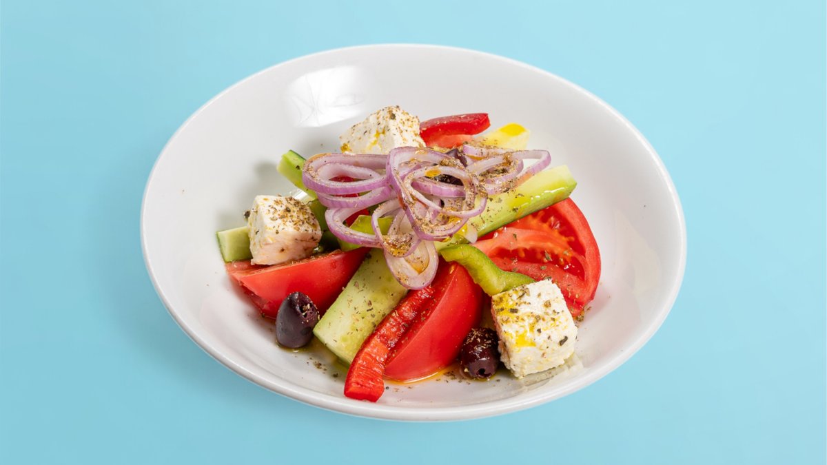 домати, краставици, пресен пипер, червен лук, риган, краве сирене, зехтин, маслини без костилка