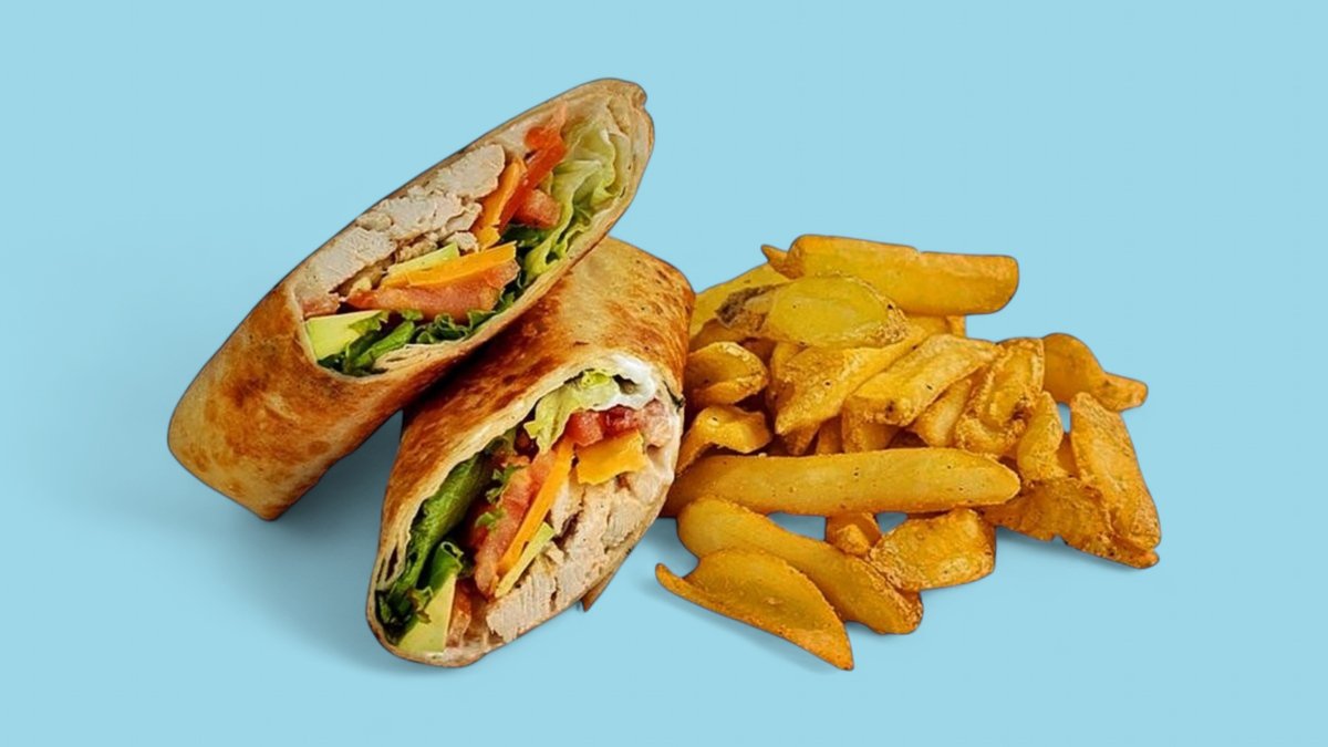 тортила питка, бекон, зелена салата, домат, Чедър сирене, песто майонеза, френски селски картофки, кетчуп, 300г
