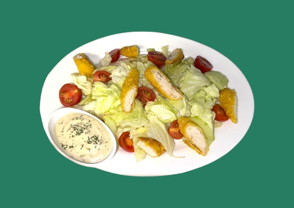 гарнирана с чери домати, краставици, айсберг и овкусена със специално приготвен сос „ Цезар “350г