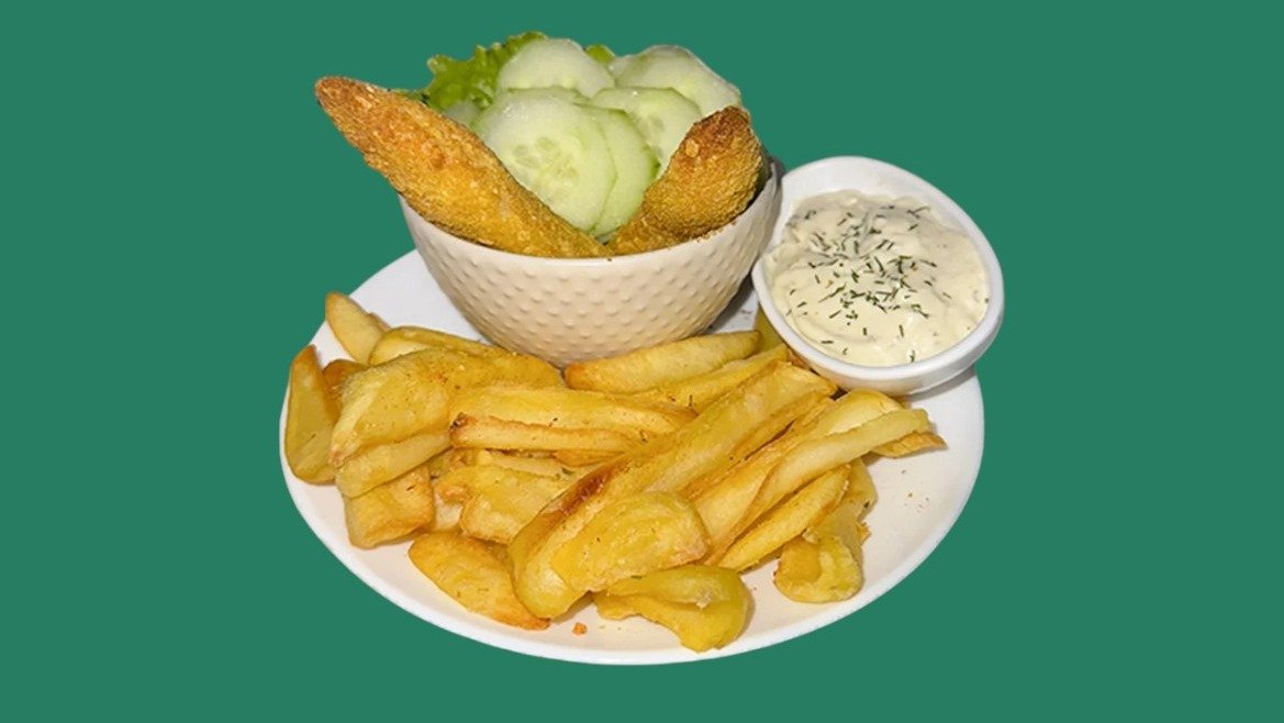 бокс меню с пилешки филенца, пържени картофки и краставички, гарнирани със сос айоли 250г