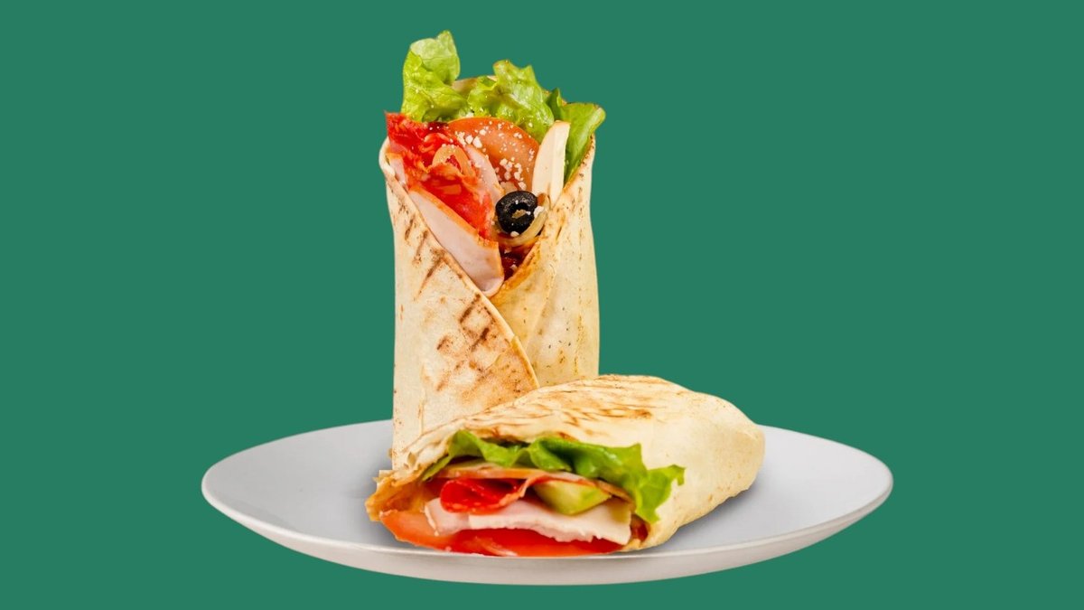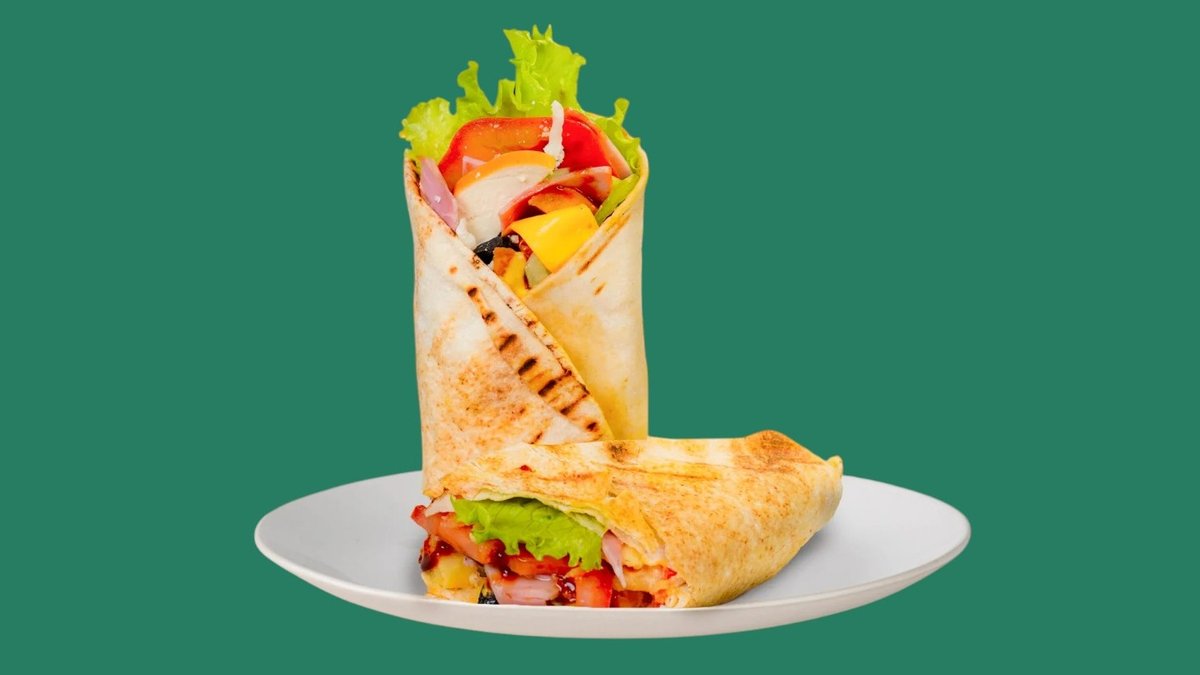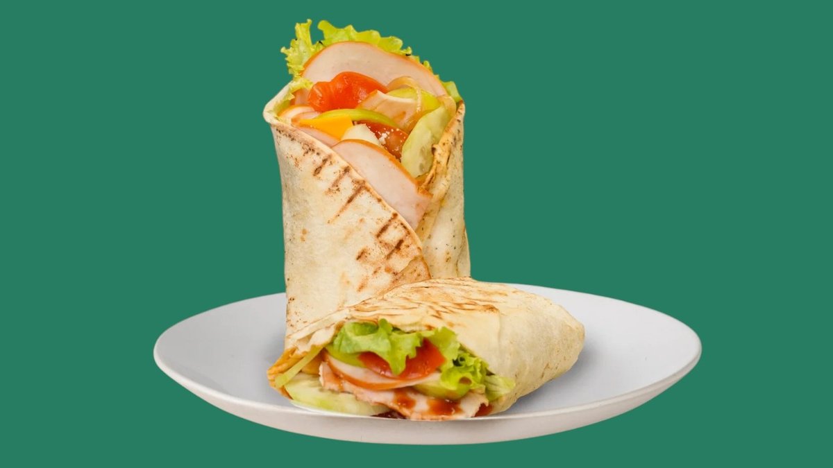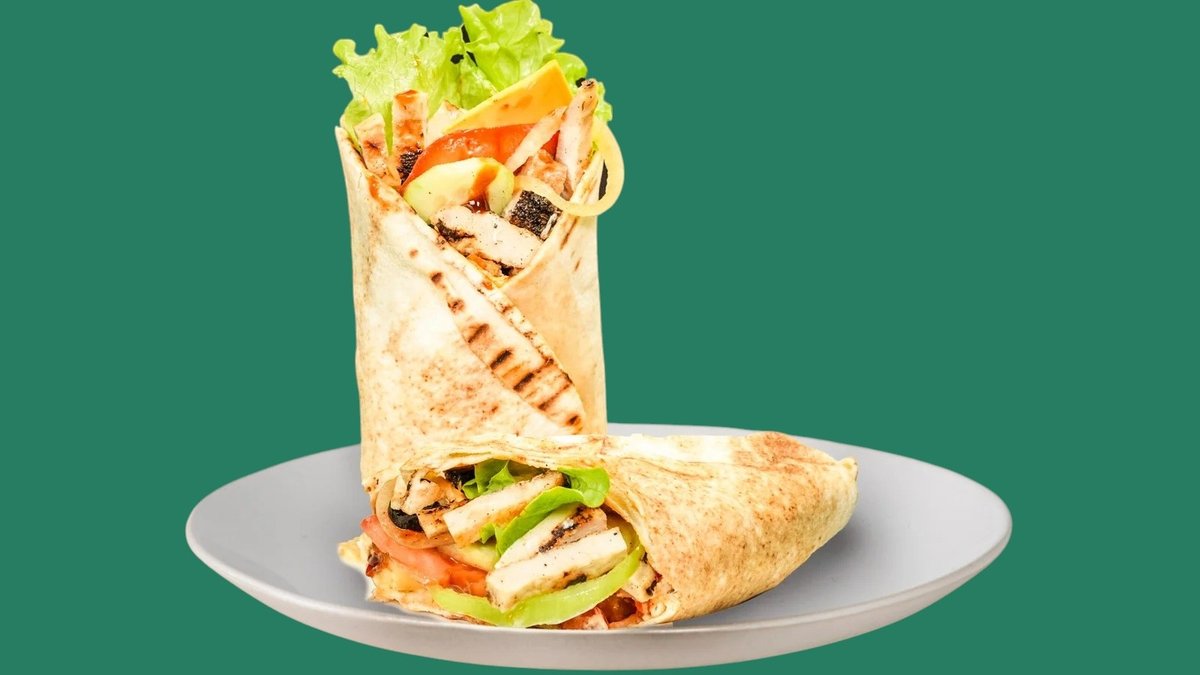 с чоризо, пуешко филе, кашкавал и Чедър сирене, запечена арабска питка, гарни-рана със свежи зеленчуци, сосове по ваш избор и пържени картофи