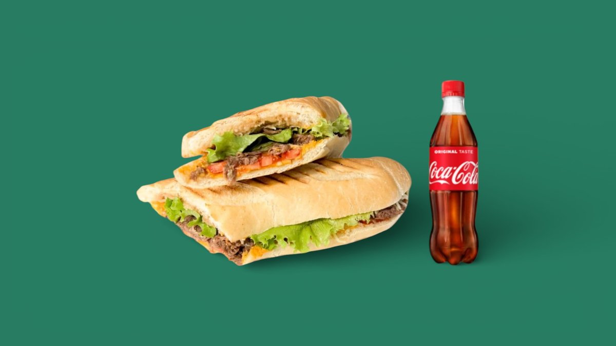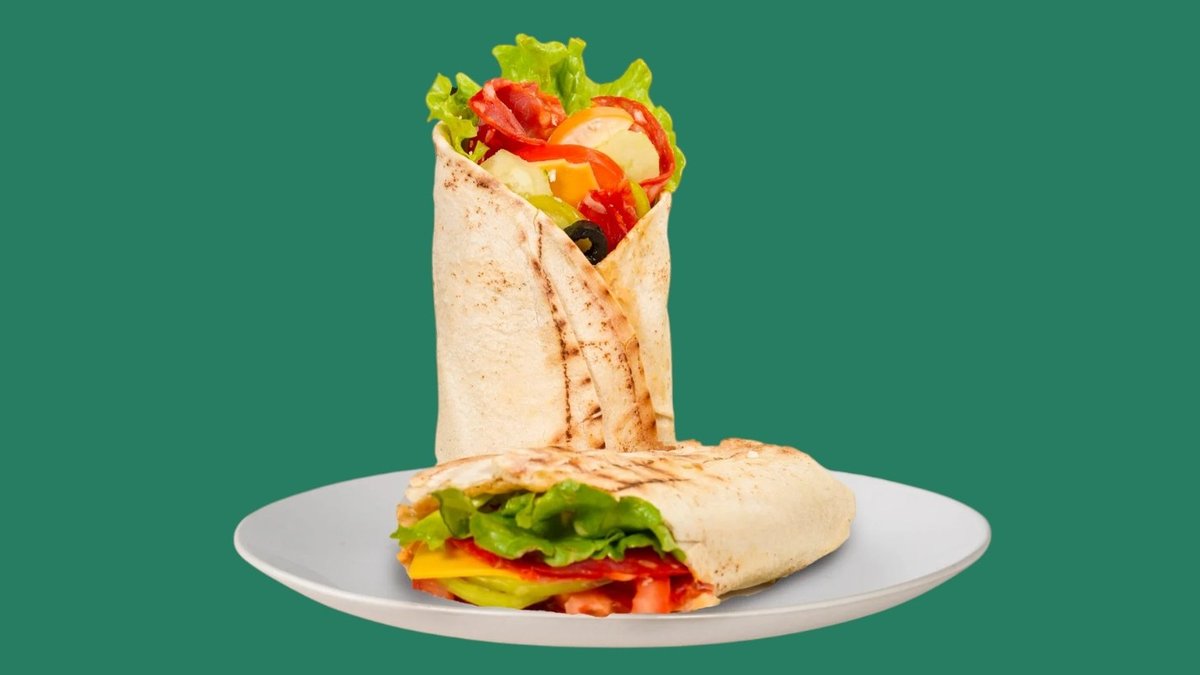 пеперони, бекон, луканка, кашкавал и Чедър сирене, гарниран със сосове и свежи зеленчуци по ваш вкус, запечени в хрупкаво хлебче