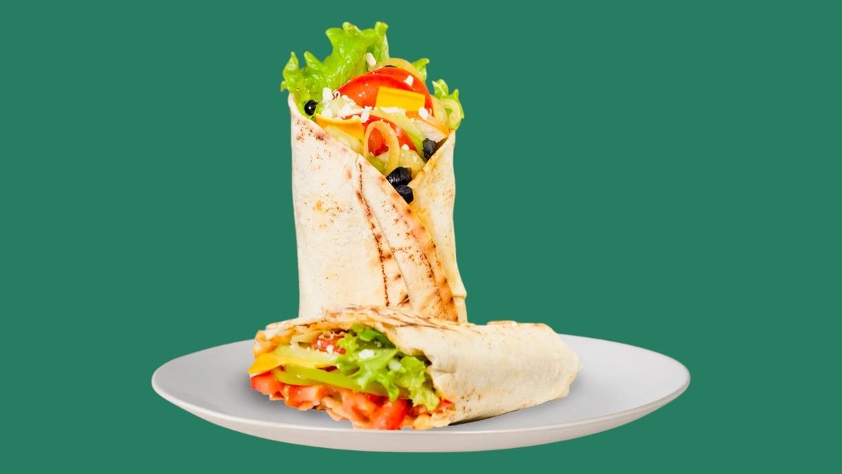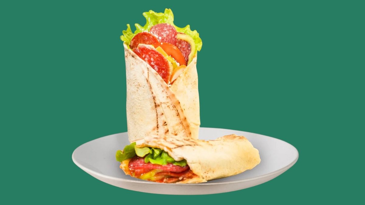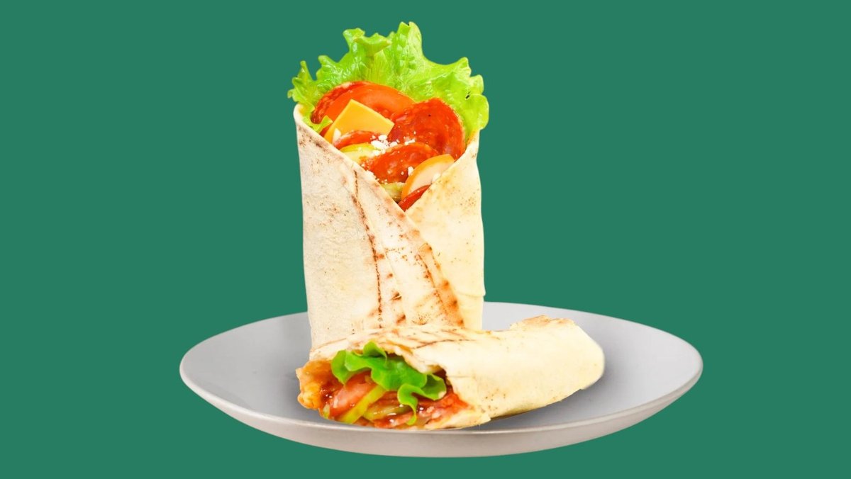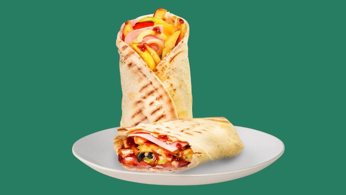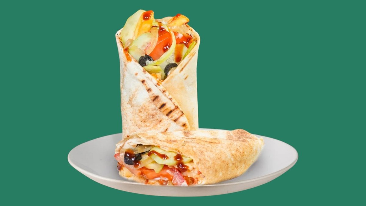 с пеперони (пикантен), бекон, луканка, кашкавал, Чедър сирене, запечена арабска питка гарнирана със свежи зеленчуци, сосове по ваш избор и пържени картофи