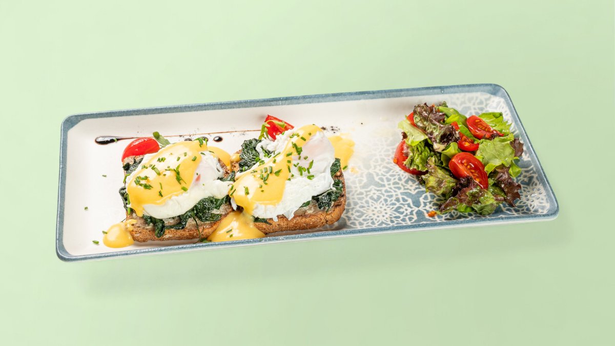 300г - препечни пълнозърнести филийки с микс от зърна и семена, пресен спанак, див лук, сос Холандез и магданозено олио