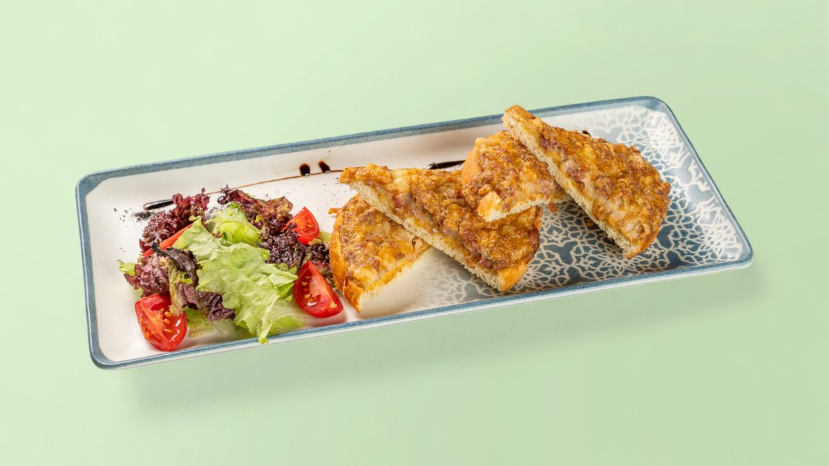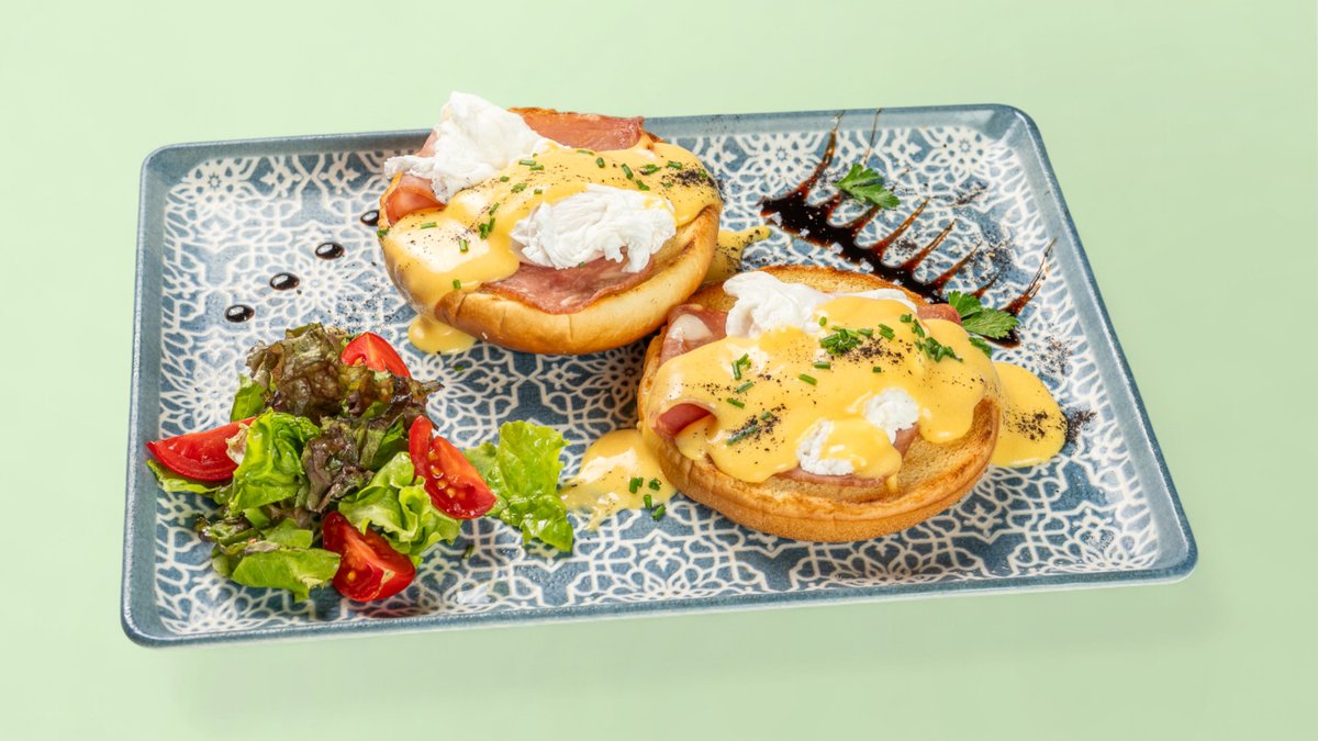 300г - яйца, масло, бекон или пушена сьомга, чери домати, питка бриош, домашен сос Холандез, микс салати, чери домати, краставици, дресинг