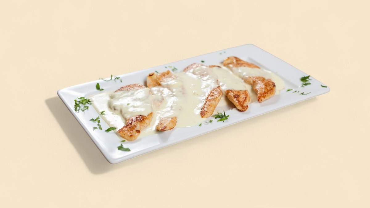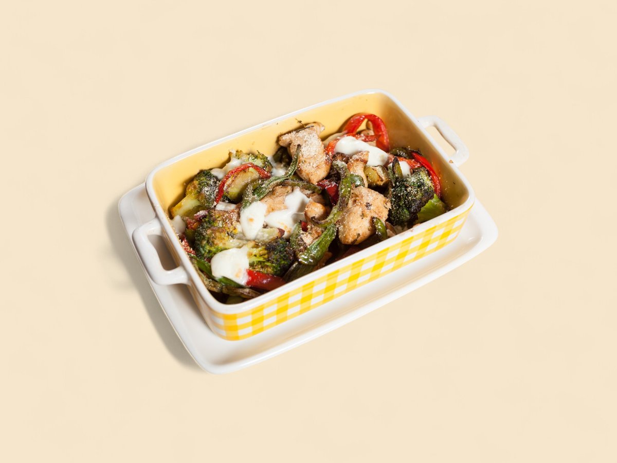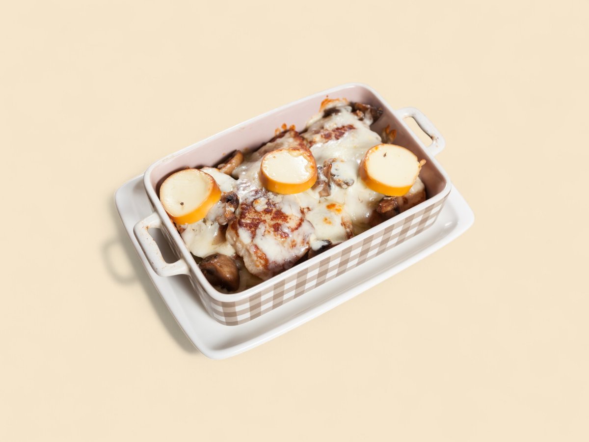 картофи, сметана, гриловано пиле, копър, топено сирене, кашкавал 450г