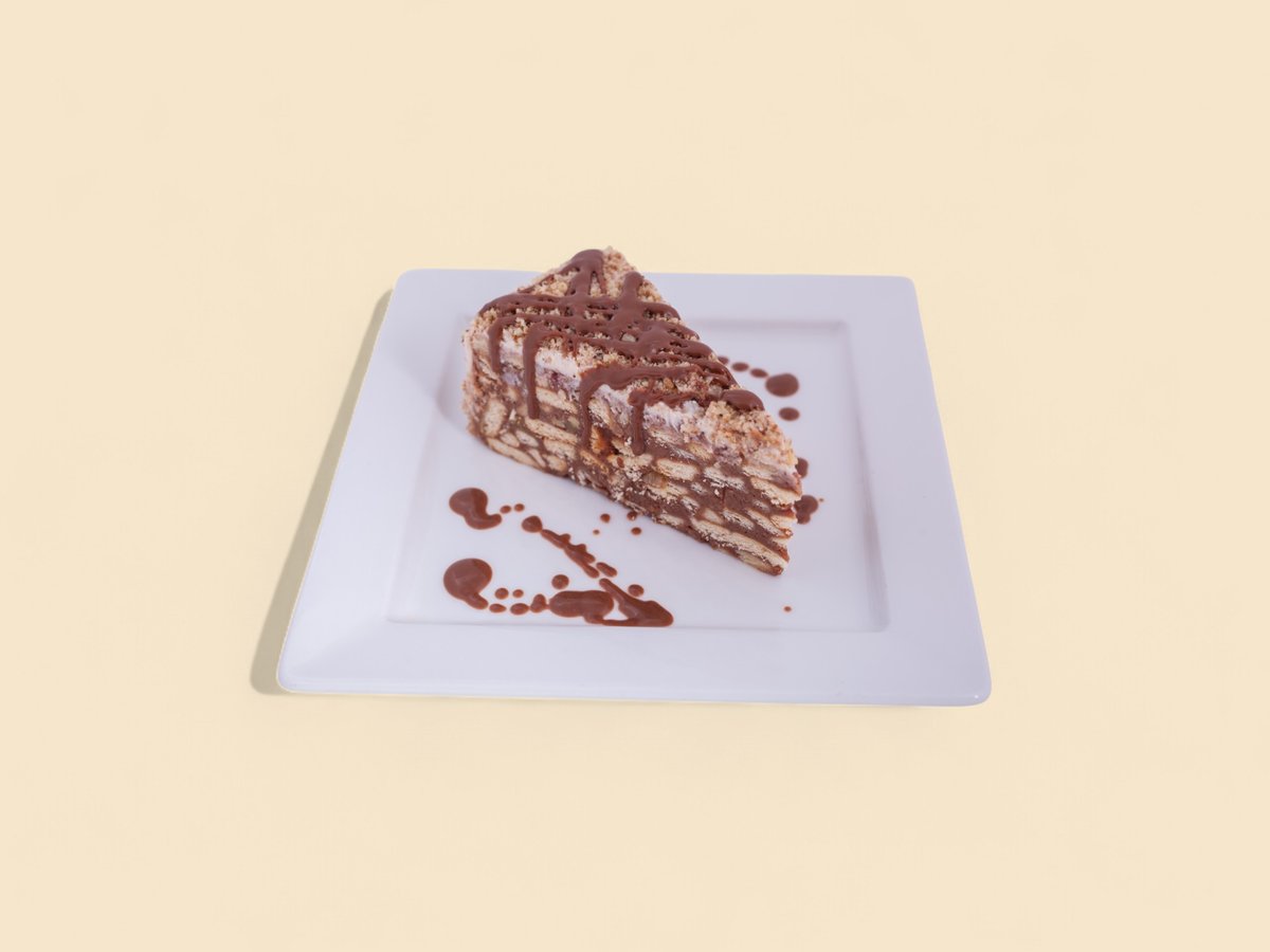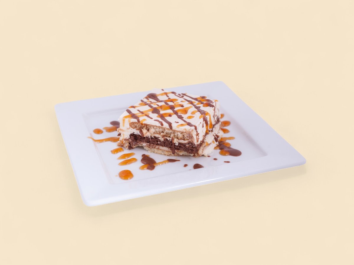 бисквитени блатове, поляти с ароматно кафе, нежен крем с маскарпоне и сметана,топинг шоколад и карамел 150г