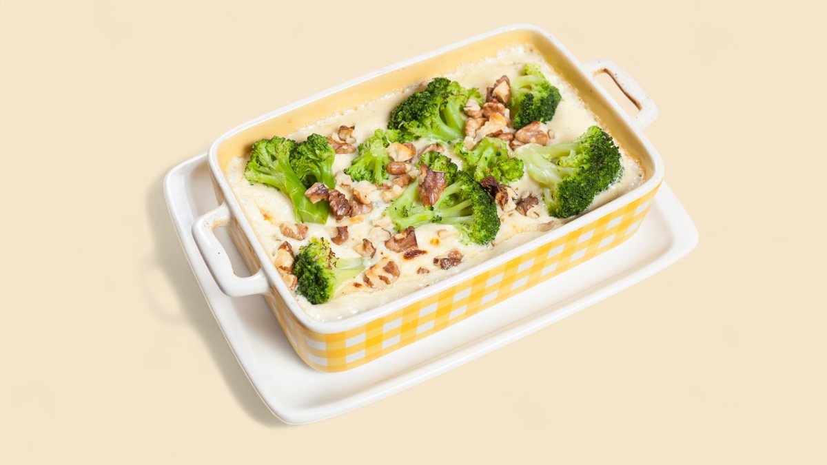 броколи, сос от четири сирена, сметана, картофи, пармезан, орехи 450г