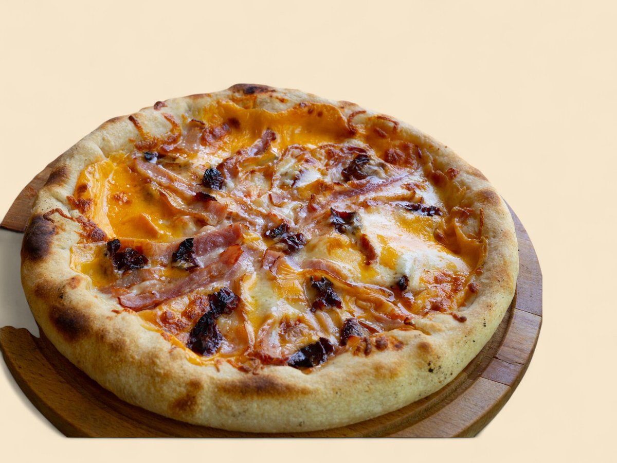 доматен сос, бекон, дебърцини, пипер, маслини, топено сирене, пресни домати, кашкавал