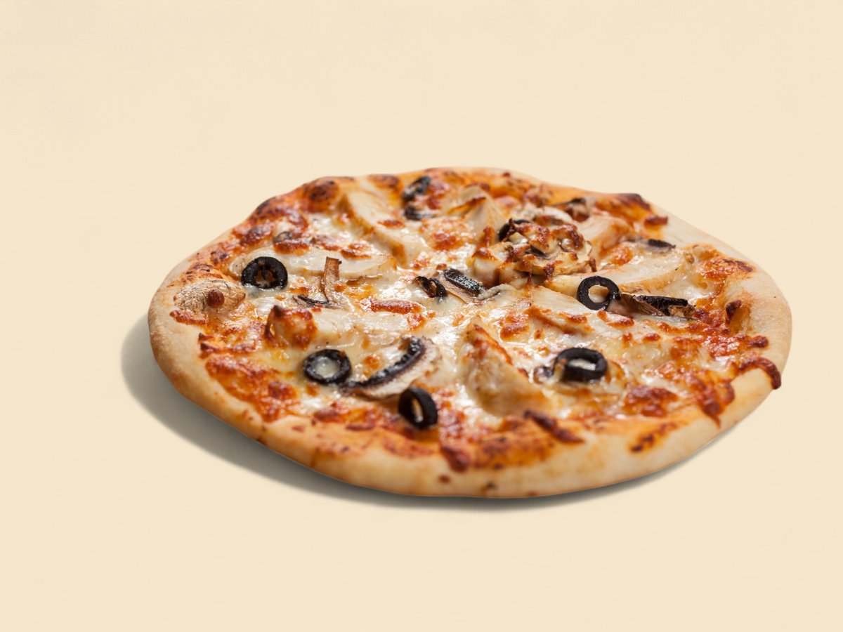доматен сос, гриловано пиле, пресни гъби, маслини, кашкавал