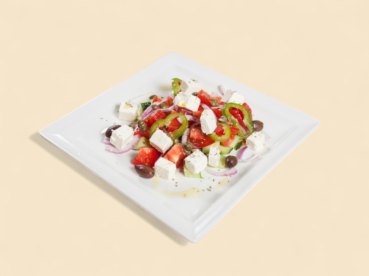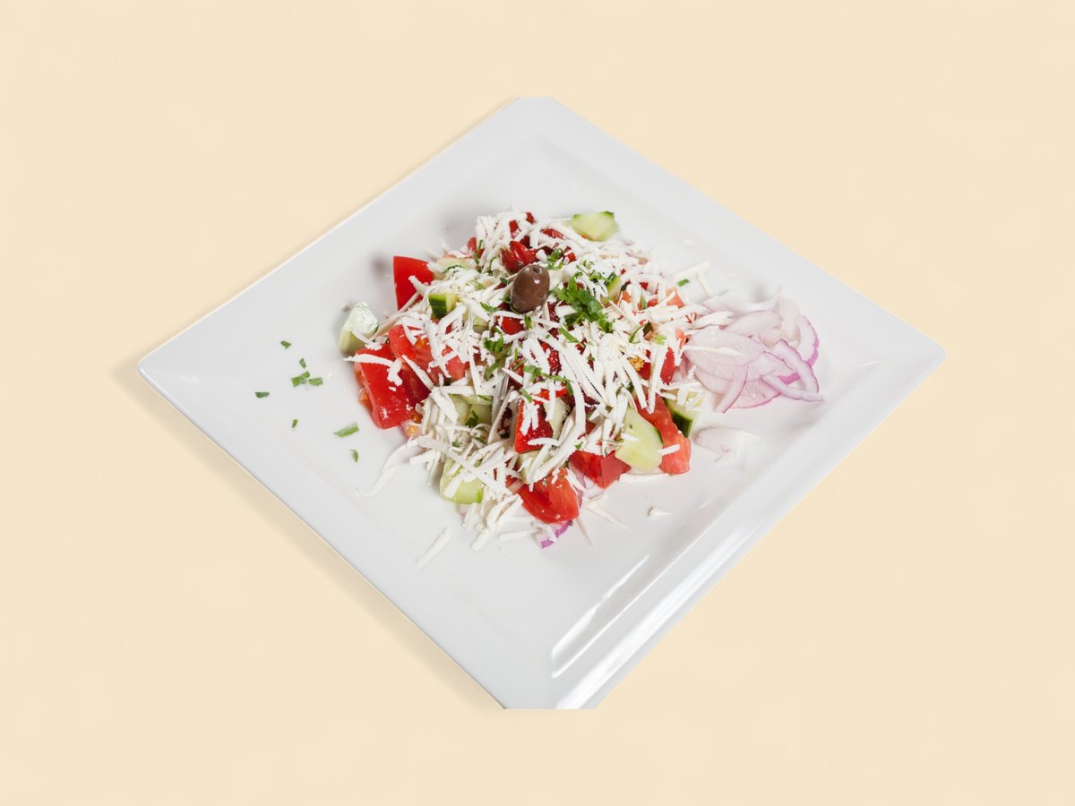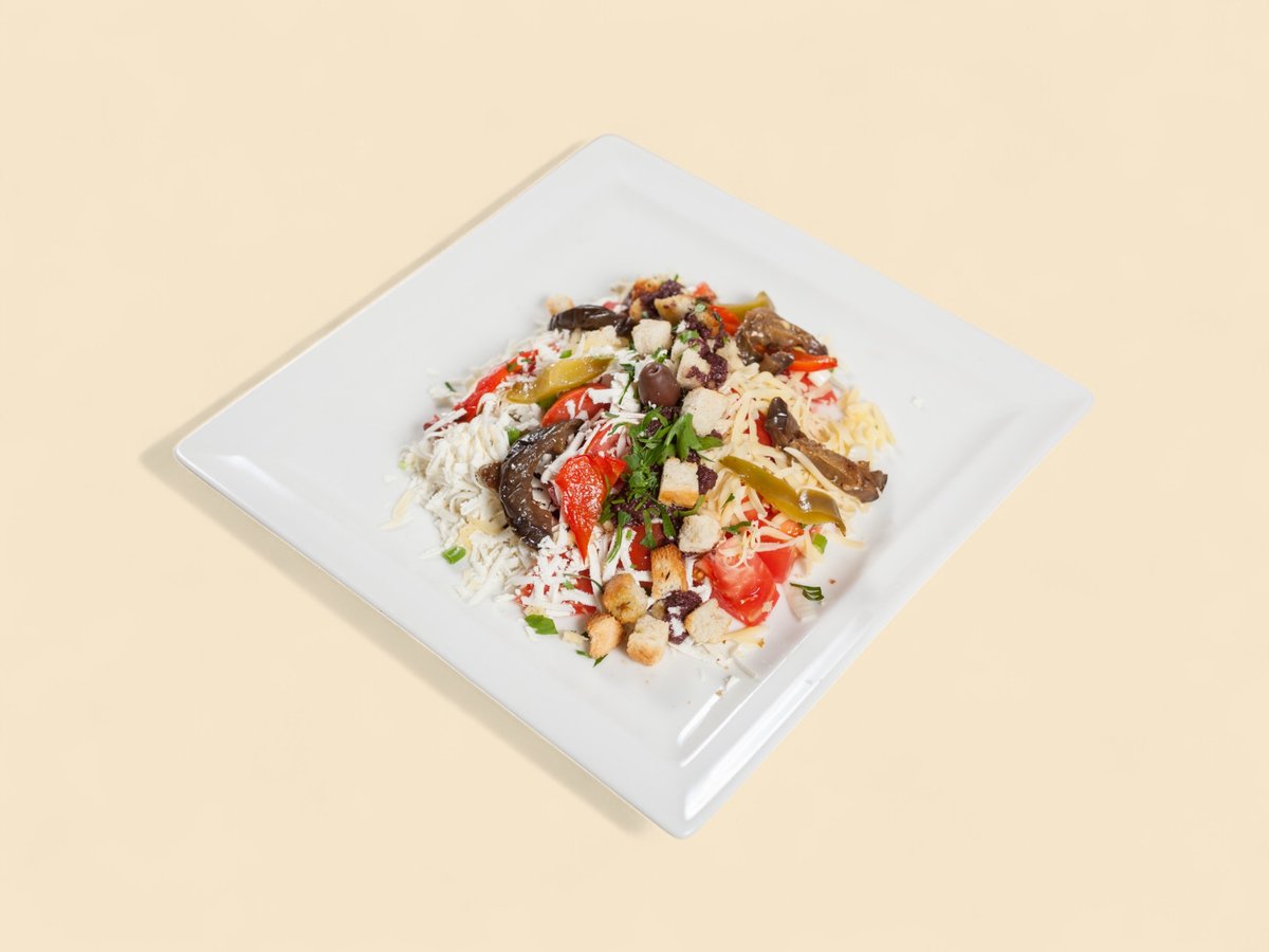 домати, краставици, лук, печен пипер, кашкавал, сирене, варено яйце, задушени гъби, магданоз 450г
