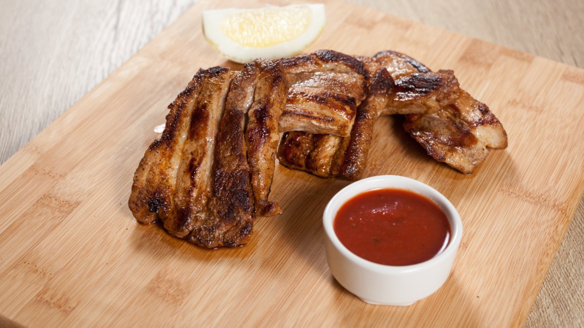 Свински ребърца с пържени картофи и барбекю сос