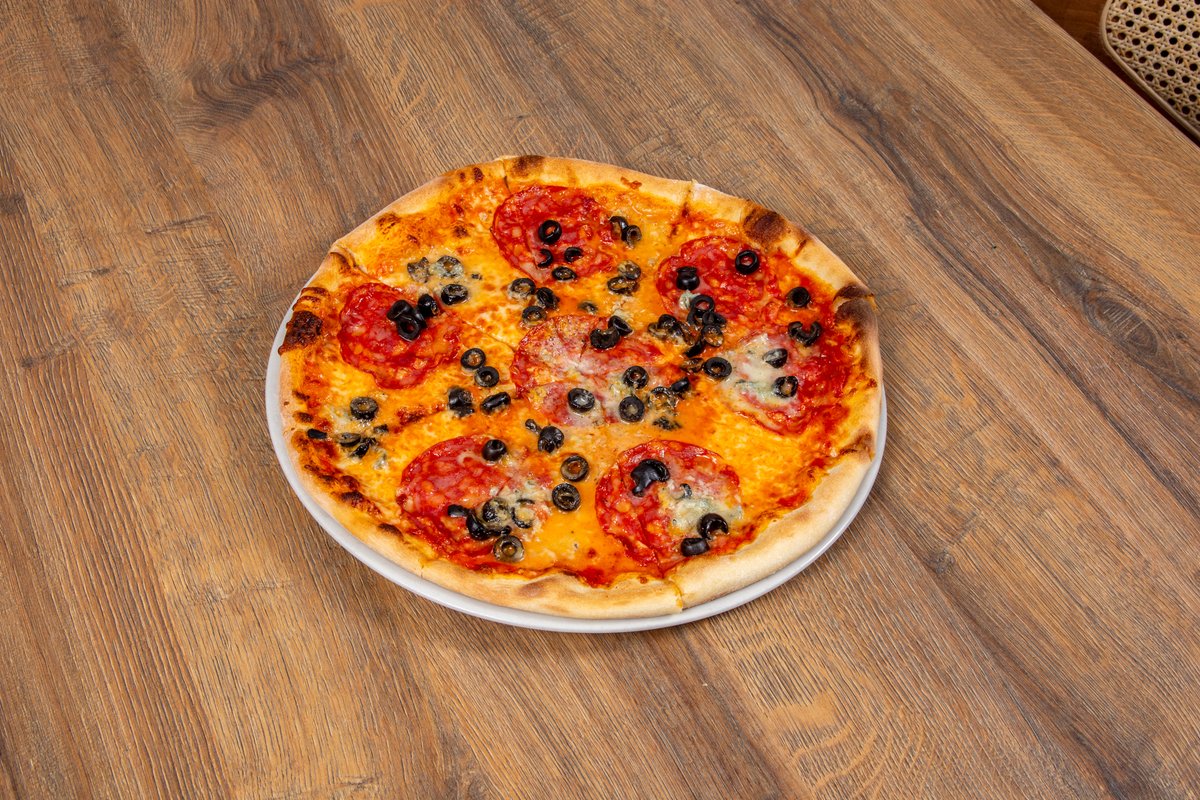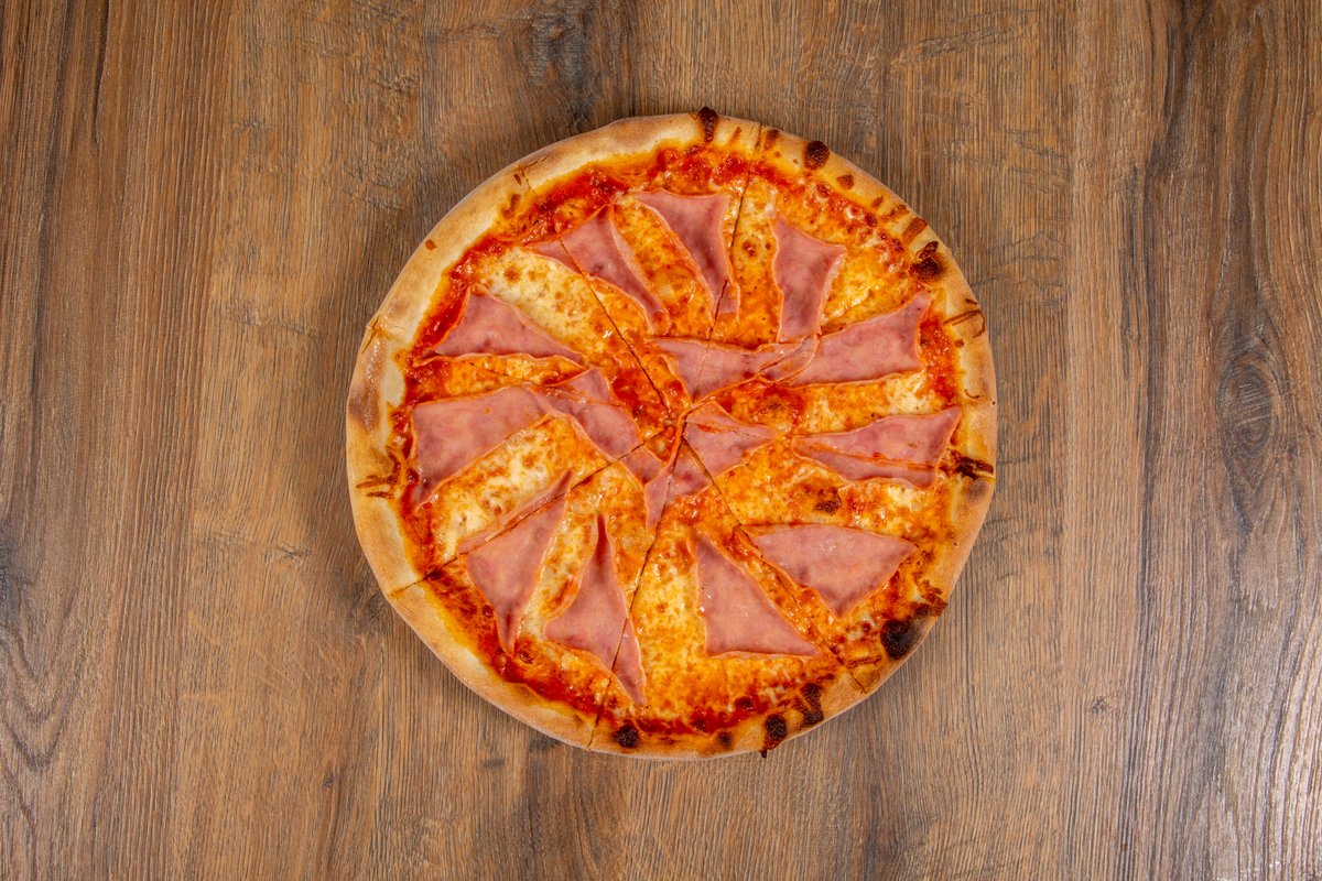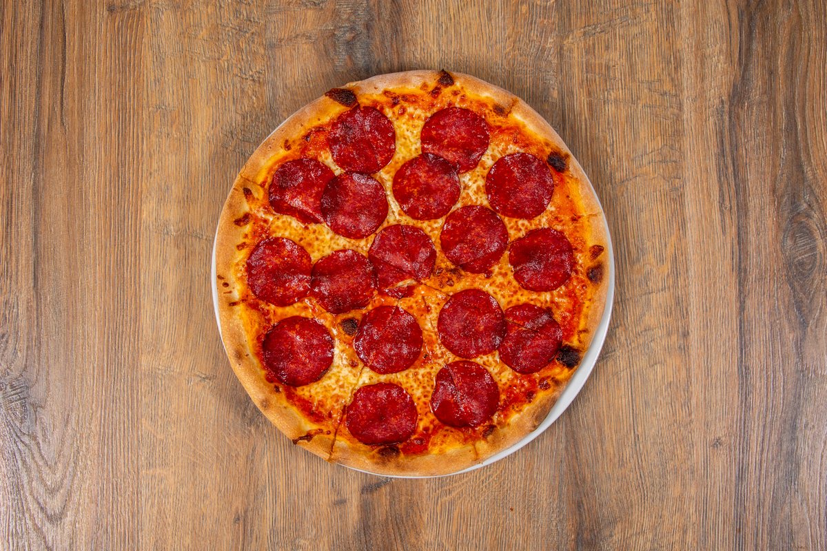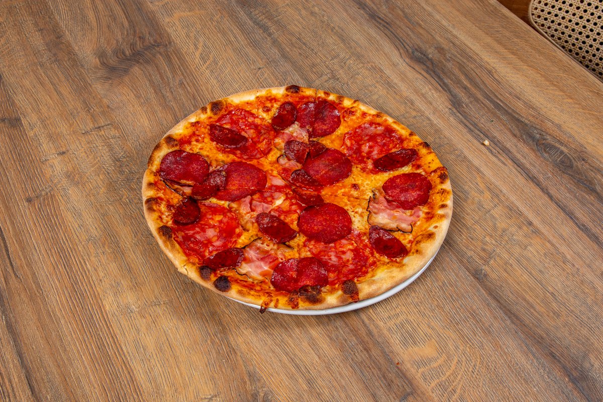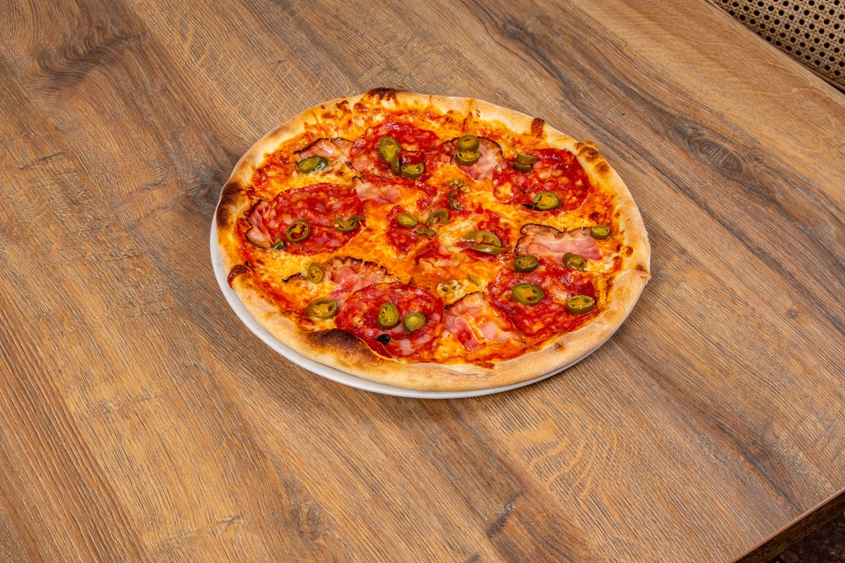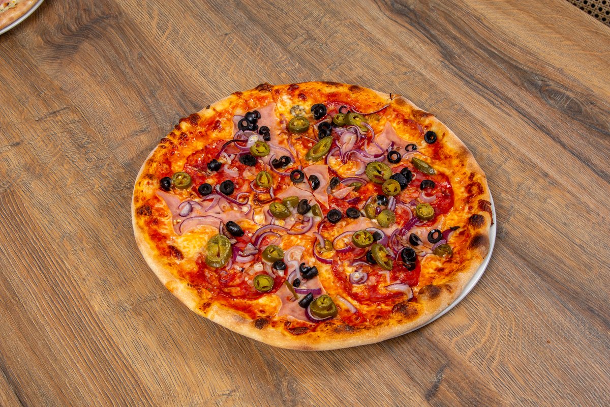 pomodoro, mozzarella, ventricina, šunka, cibule, olivy, jalapeños