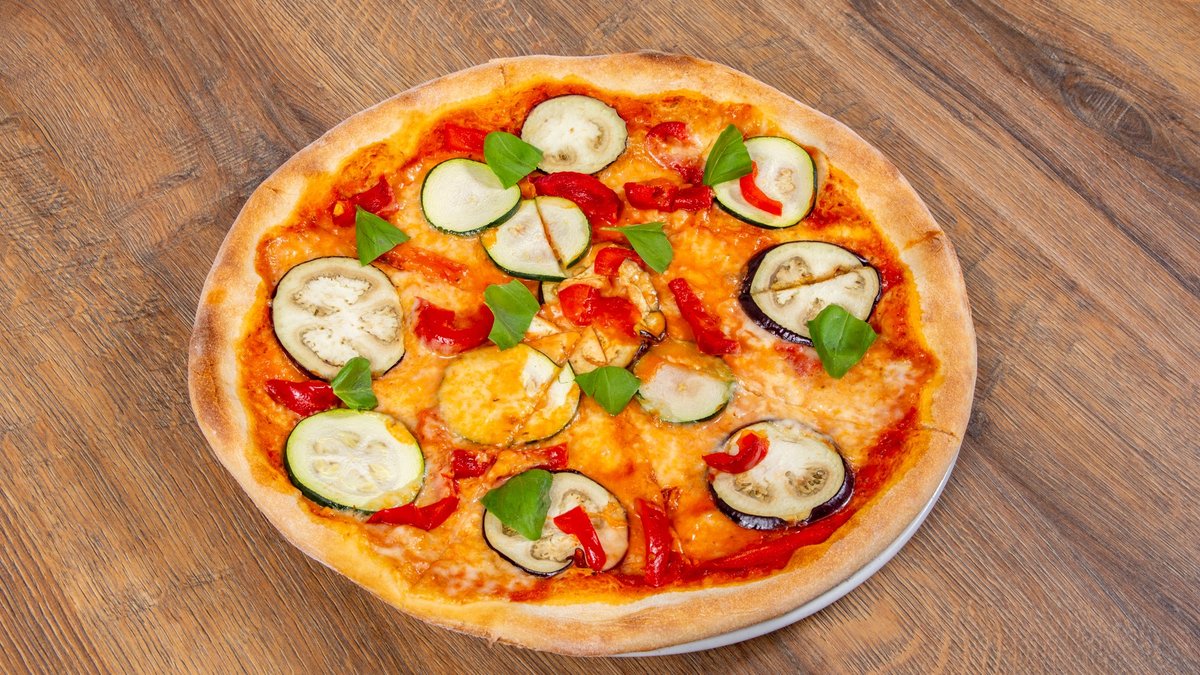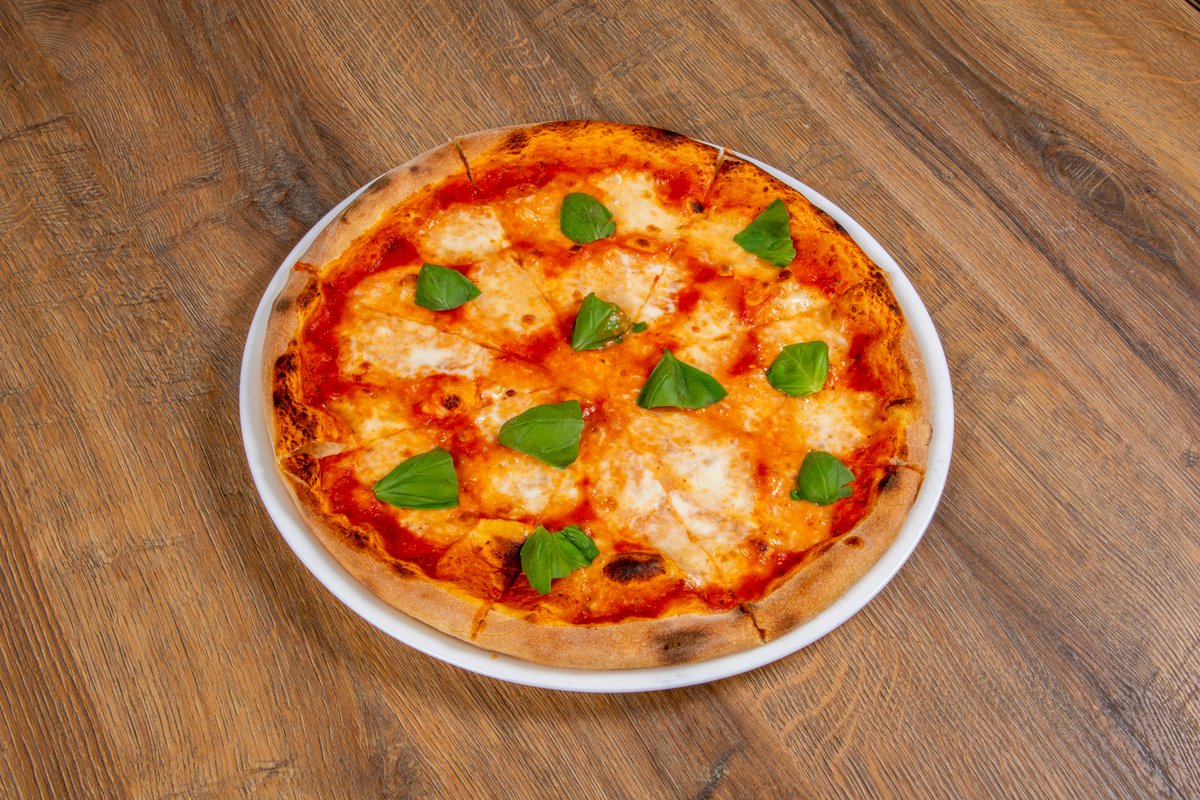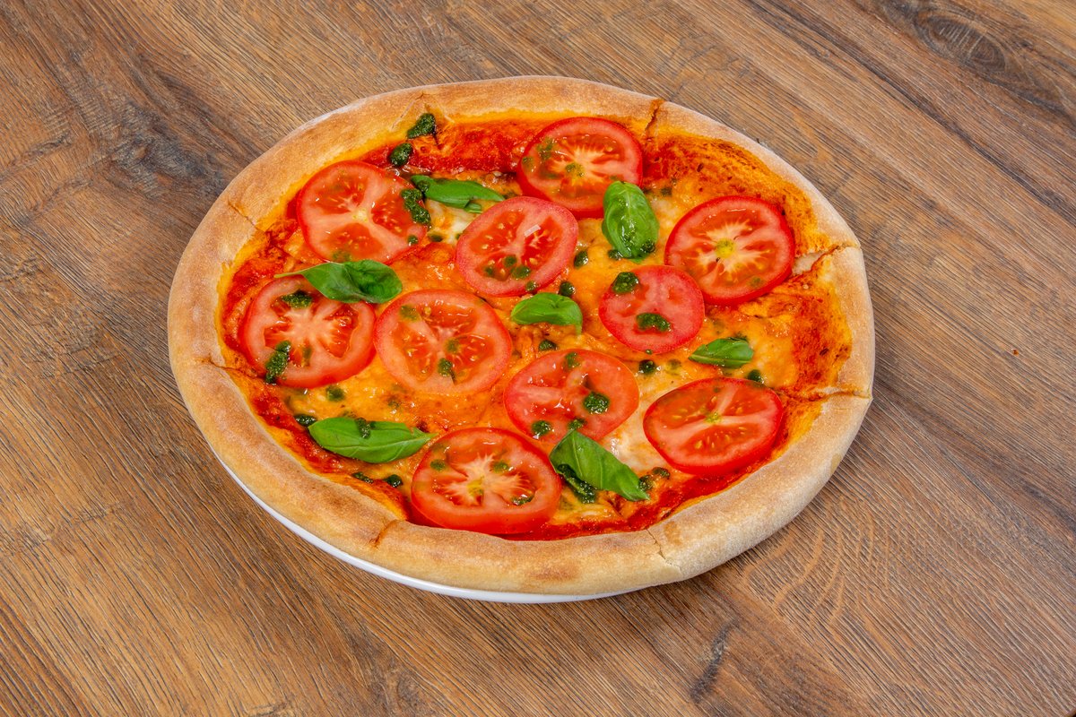 Pomodoro, bazalkové pesto, nakládaná mozzarella, cherry rajče, bazalka (z důvodů zachování kvality se tato pizza připravuje ve velikosti 28 cm!)