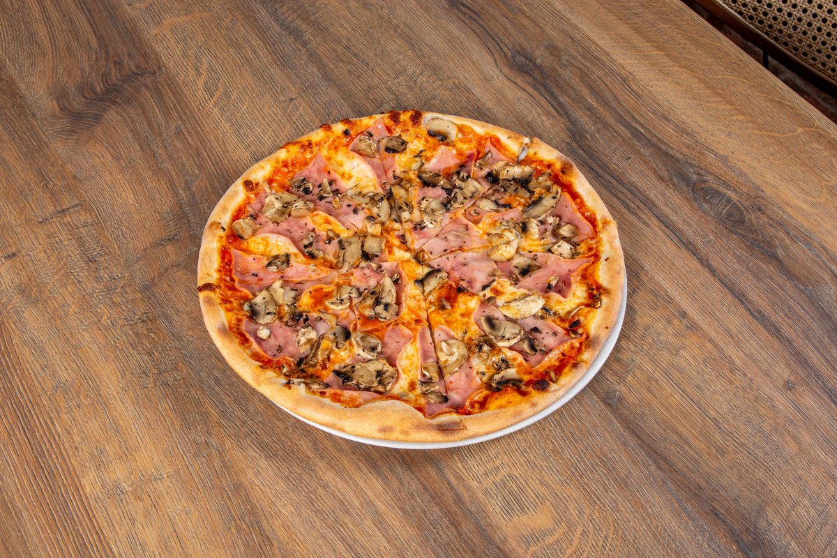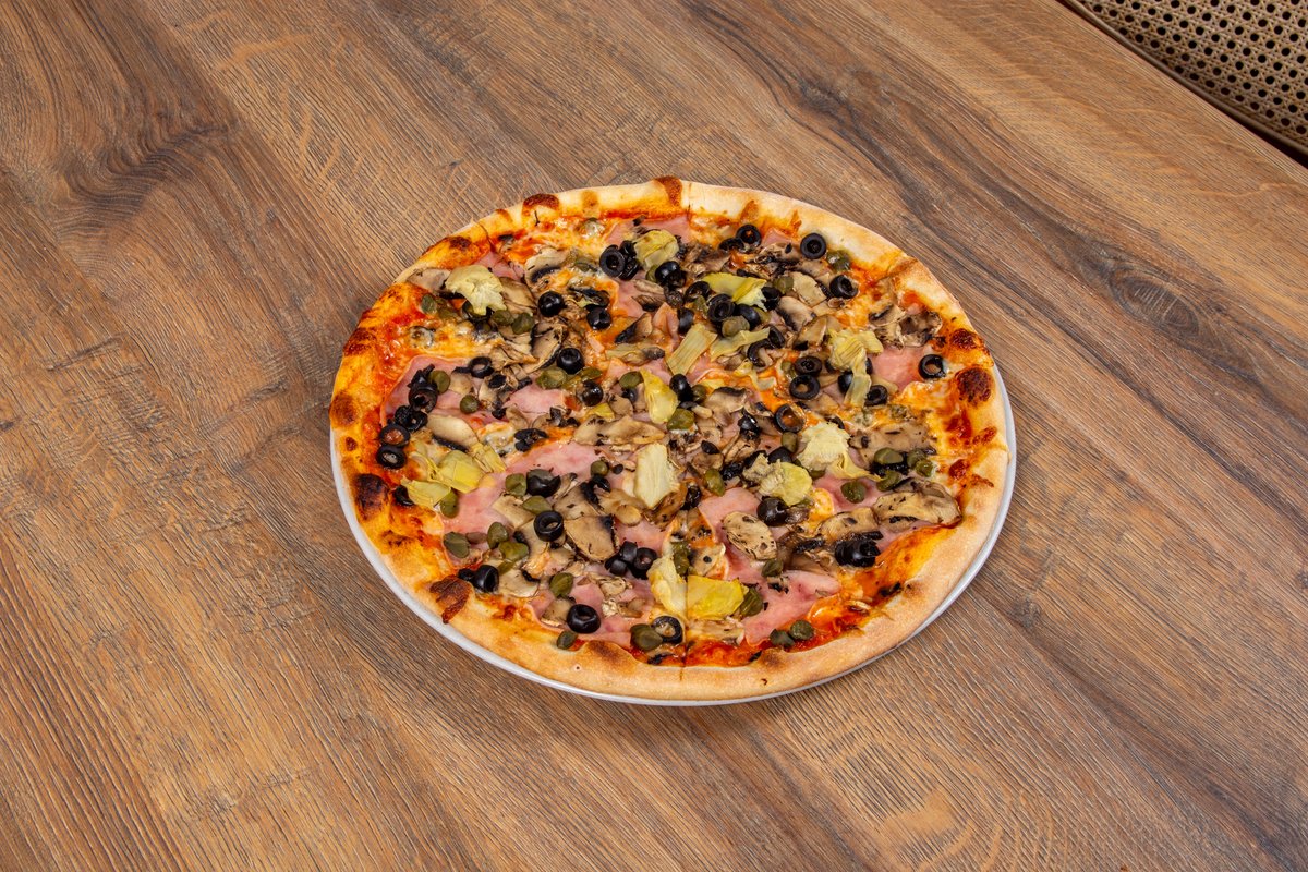 pomodoro, mozzarella, šunka, žampiony, olivy, artyčoky, kapary