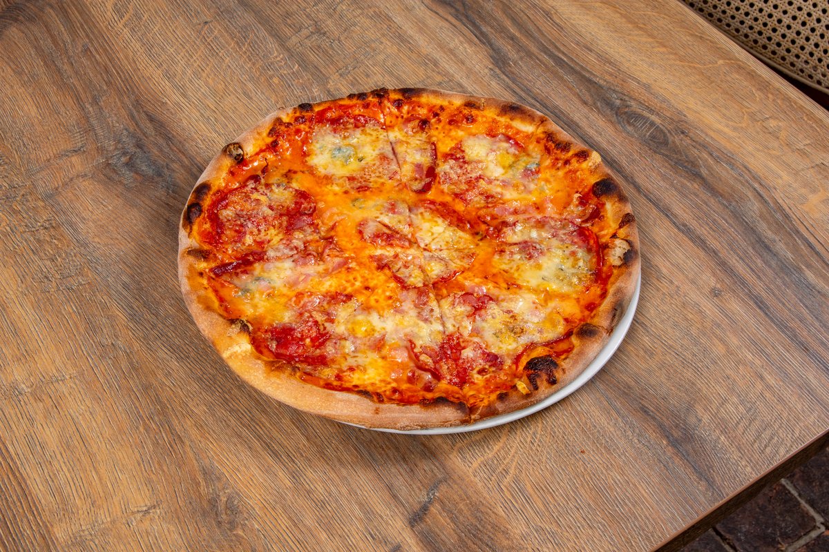 Smetana, mozzarella, ventricina, salám, gorgonzola, fontina sýr, parmazán