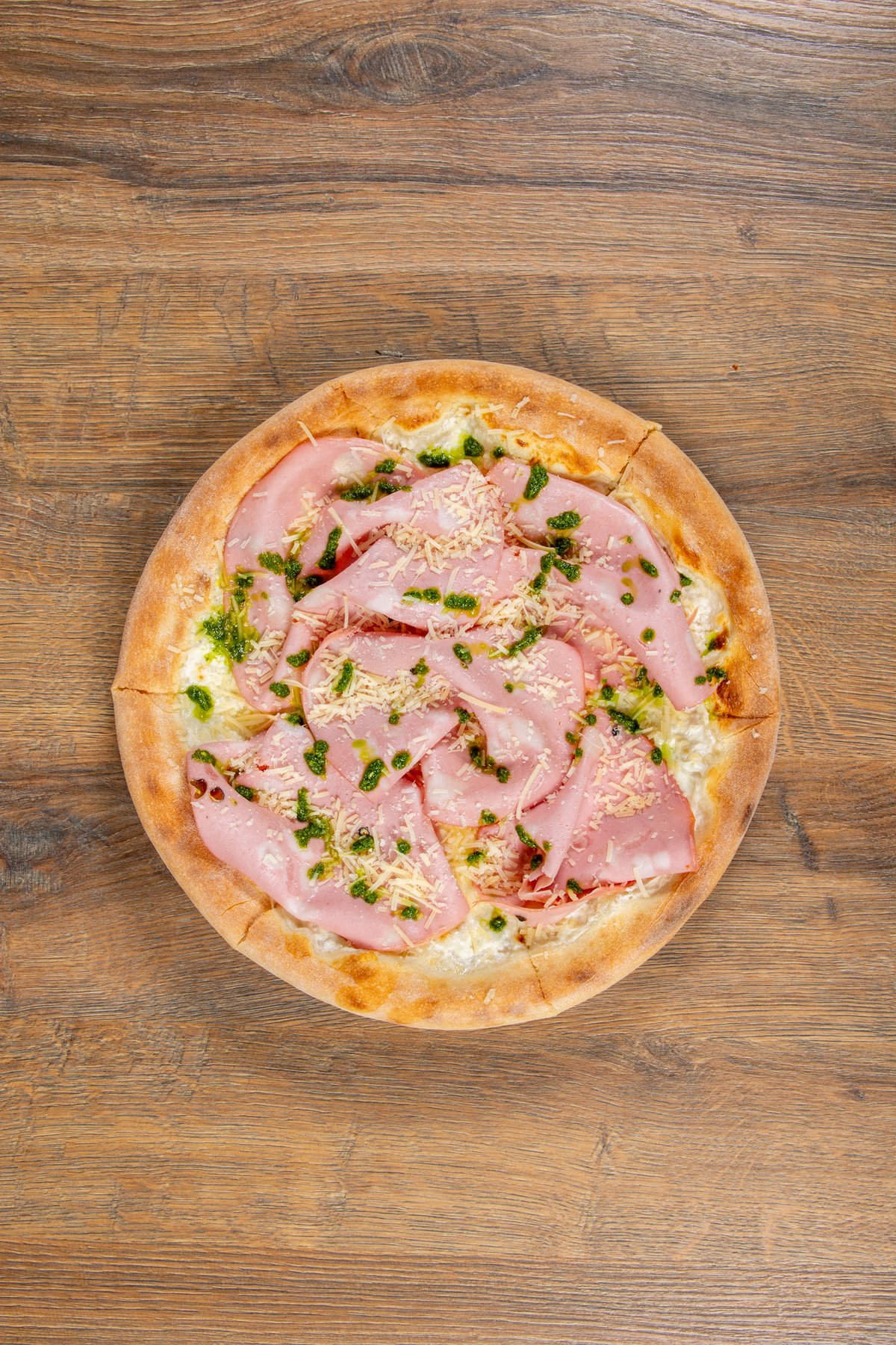 Smetana, mortadella, trhaná mozzarella, pistáciové pesto, parmazán (z důvodů zachování kvality se tato pizza připravuje ve velikosti 28 cm!)