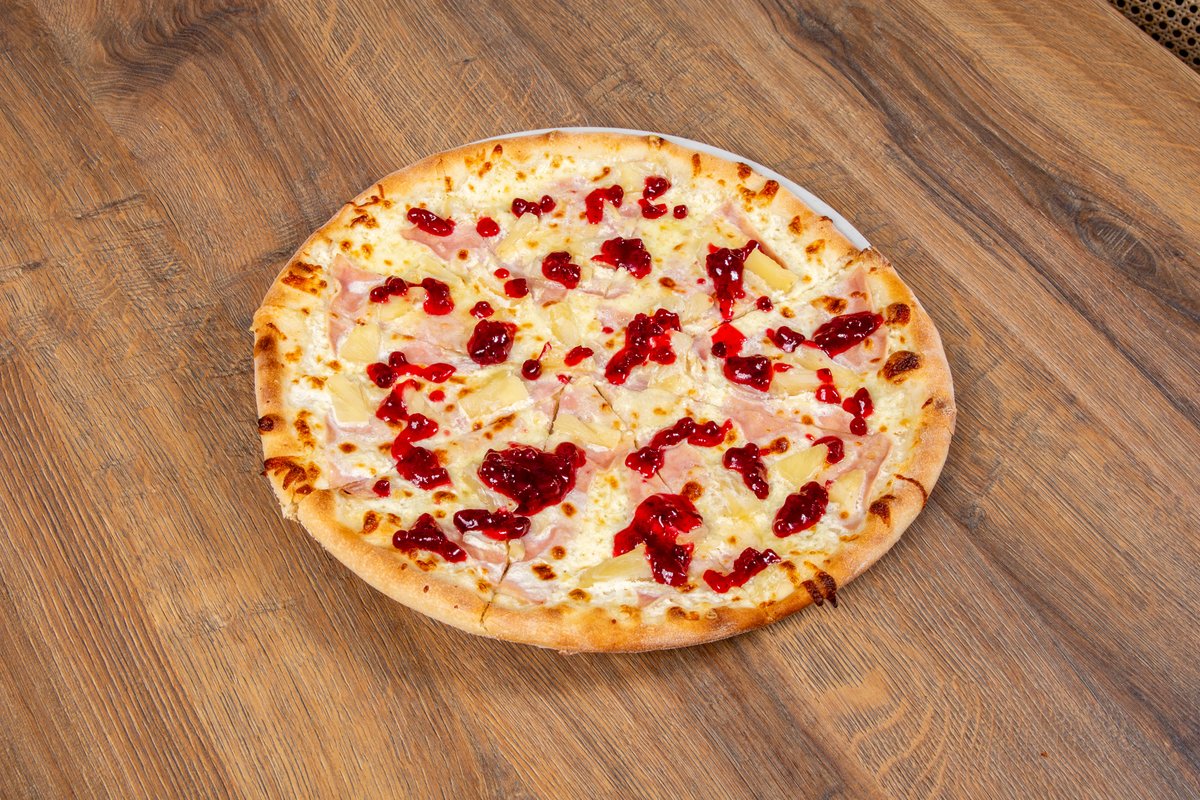 smetana, mozzarella, šunka, fontina sýr, brusinky, ananas