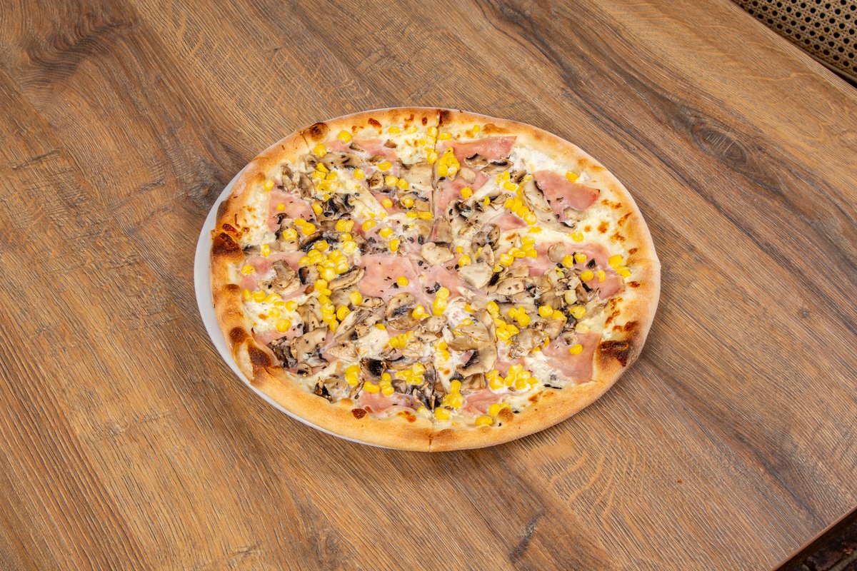 smetana, mozzarella, žampiony, šunka, kukuřice