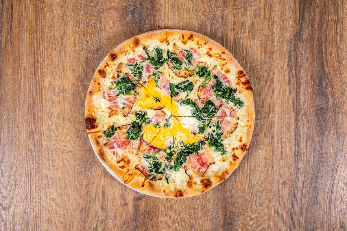 smetana, slanina, špenát, mozzarella, vejce, parmezán