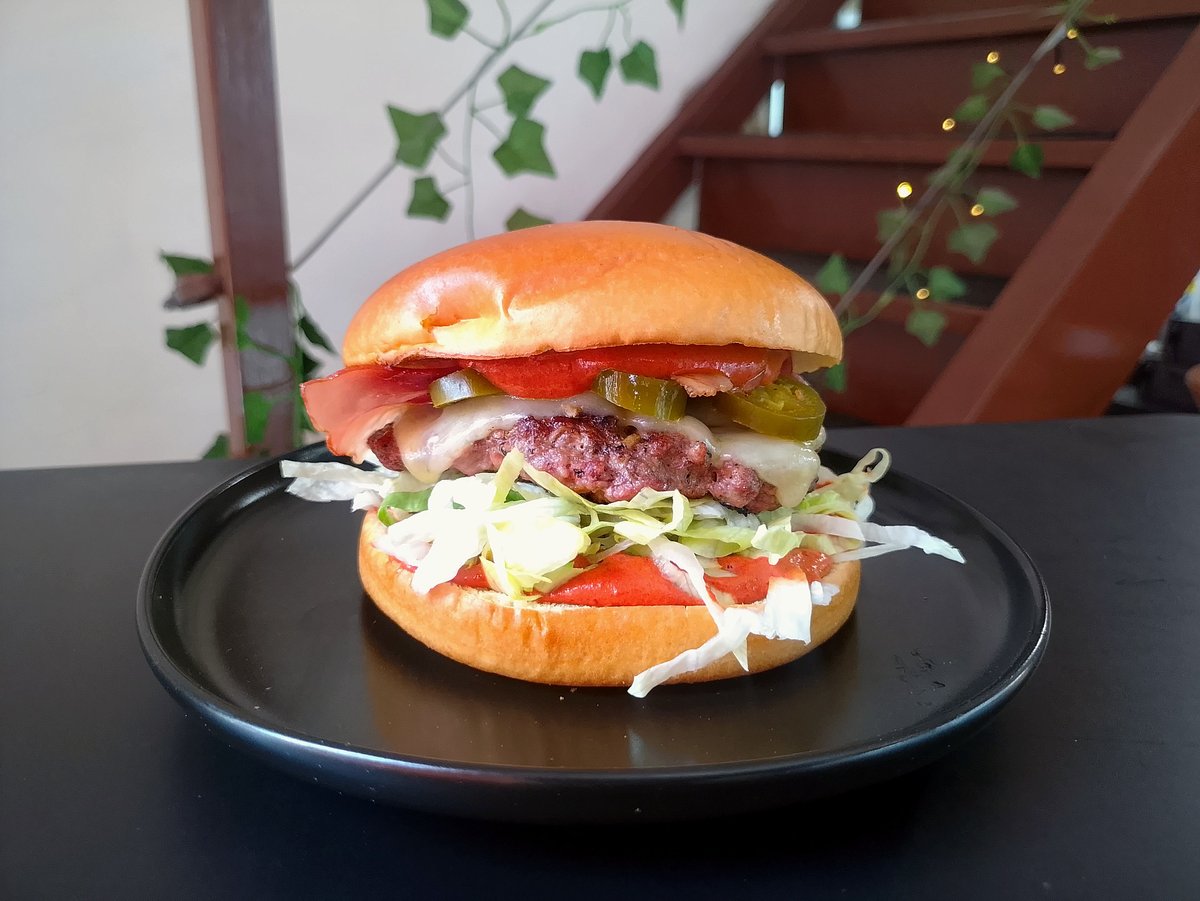 120g/240g mletého jehněčího, Monterey Jack sýr se slaninou, jalapeňos a ledovým salátem s jemně pikantní omáčkou z Guajillo papriček