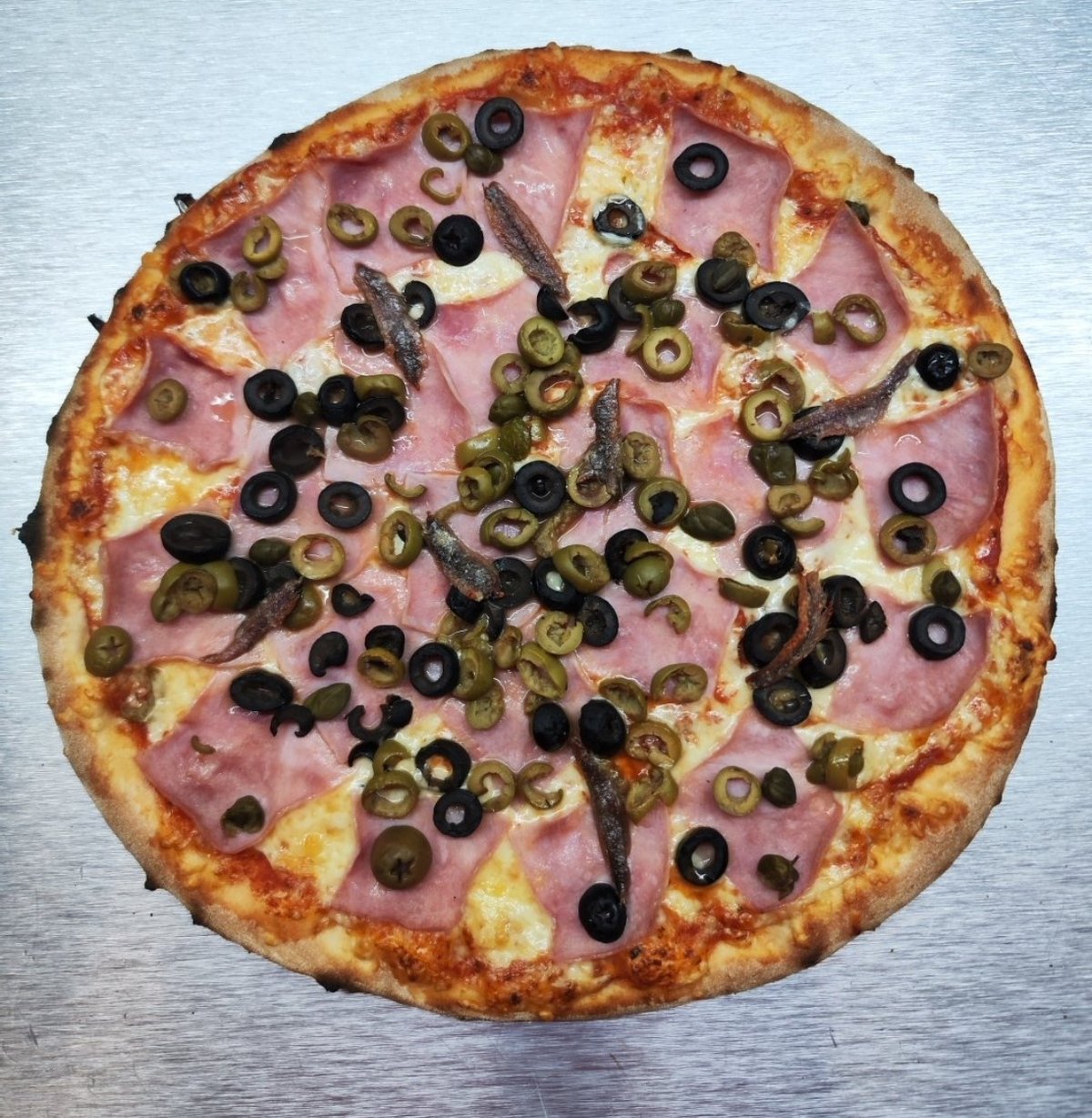 rajčatová omáčka, mozzarella, šunka, olivy, ančovičky, kapary