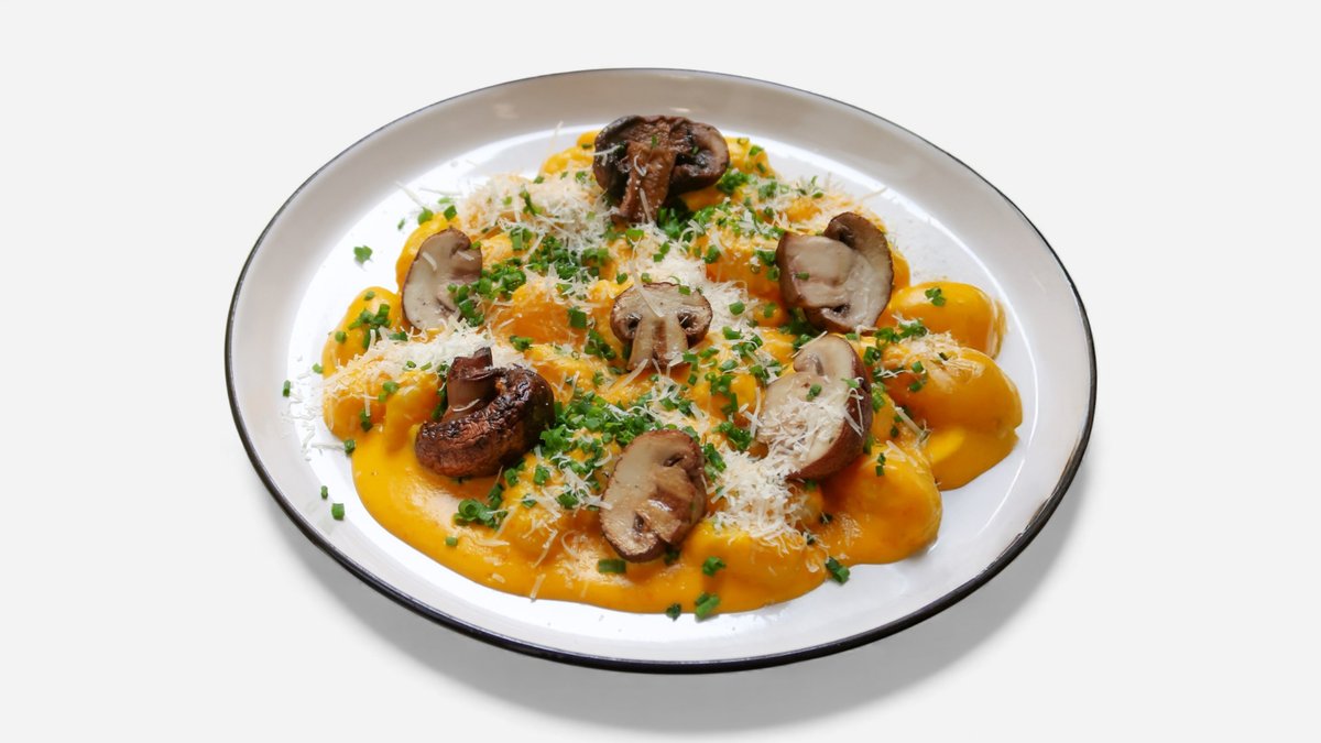 Bramborové gnocchi v sýrové omáčce, bazalka, sýr Gran Moravia