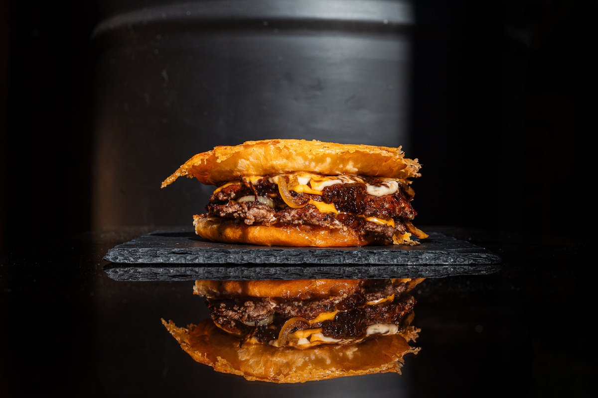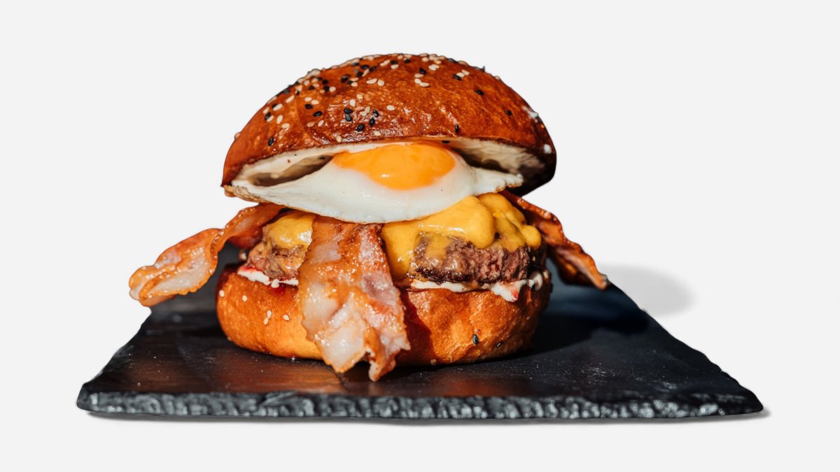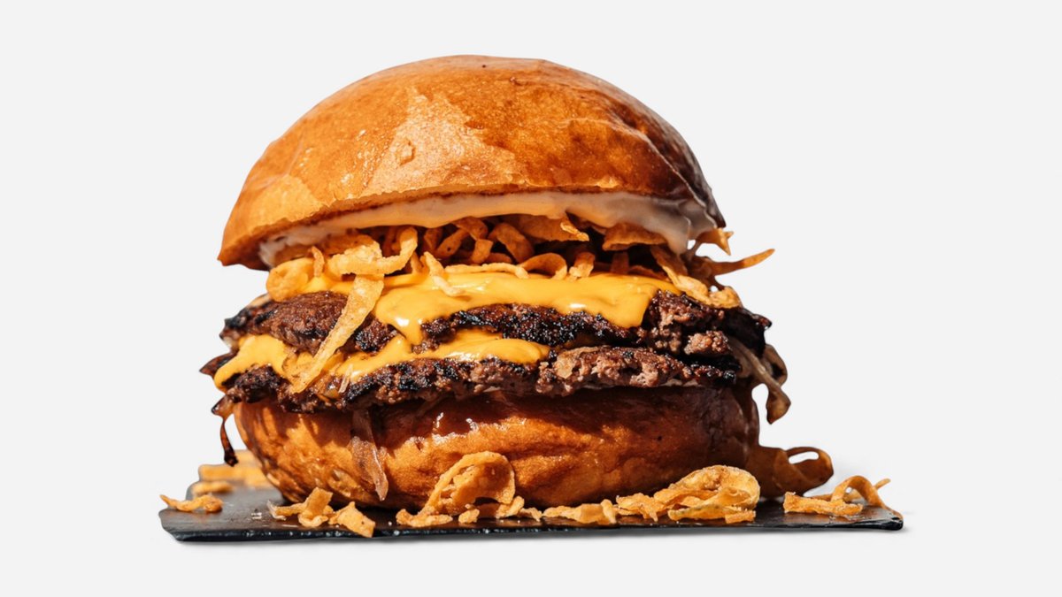 2 x 75g BIO hovězí maso vysmashované na tenký plátek, slaninový jam, grilovaná cibule, naše burger mayo, 4x plátek amerického cheddaru, naše máslová bunska vysmashovaná s cheddarem